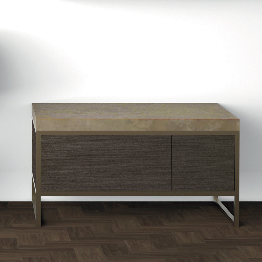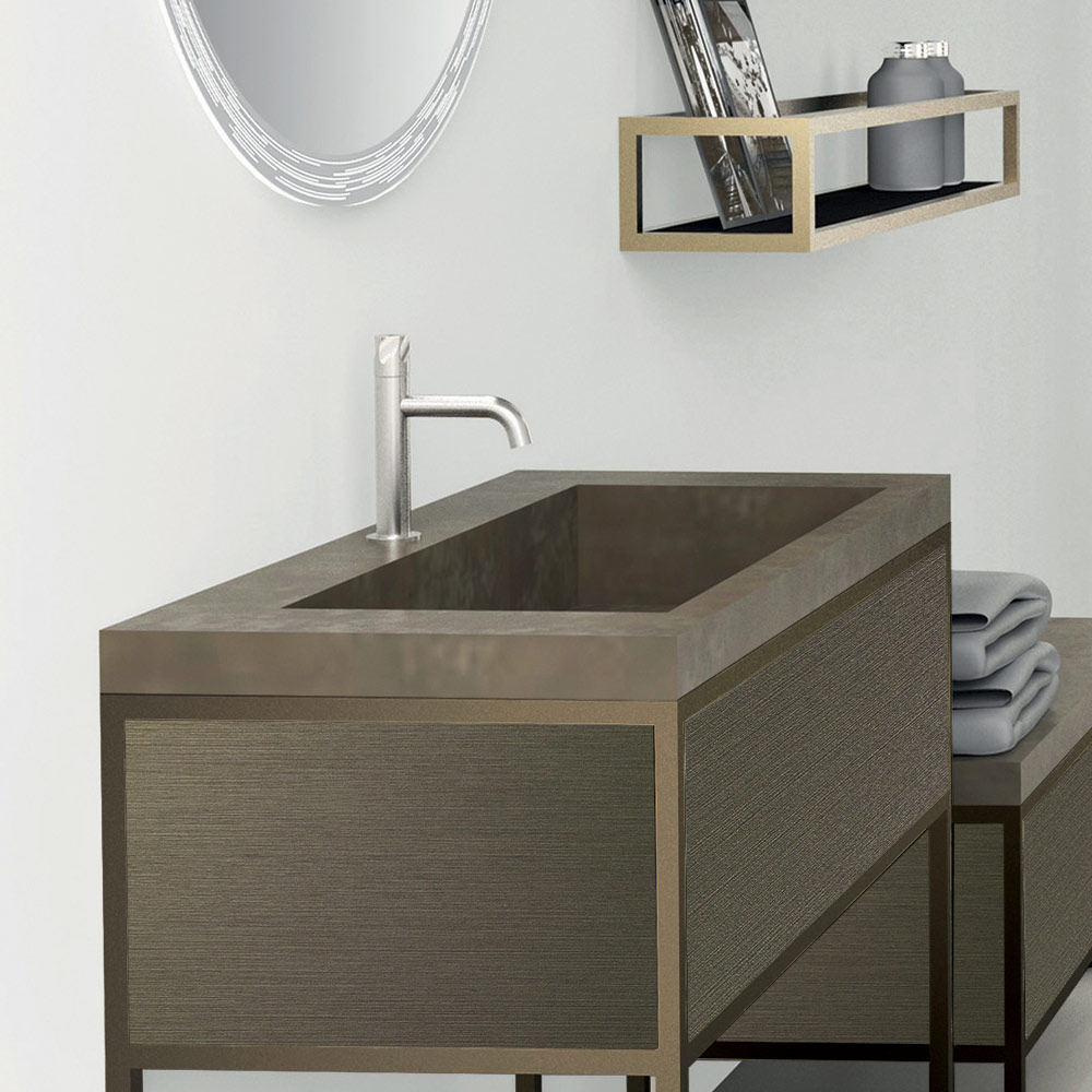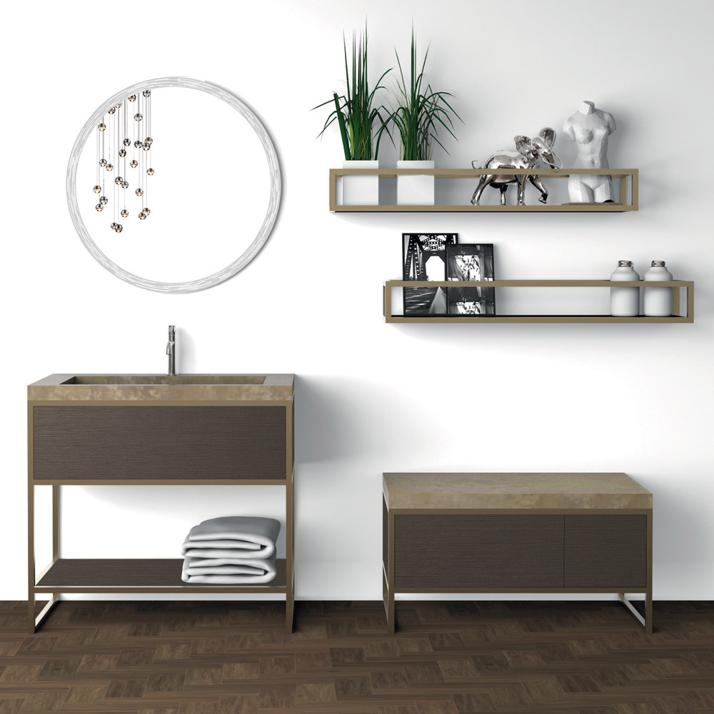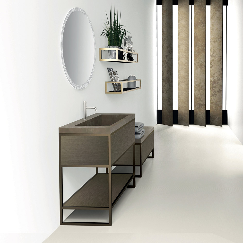 koupelnového nábytku se vyznačuje strukturou vyrobenou z tenkého kovového profilu v povrchové úpravě starožitný bronz, který rámuje dveře z kovového bronzu z ekologického dřeva a vytváří harmonickou kombinaci plného a prázdného prostoru. Kovová povrchová úprava dveří zdůrazňuje