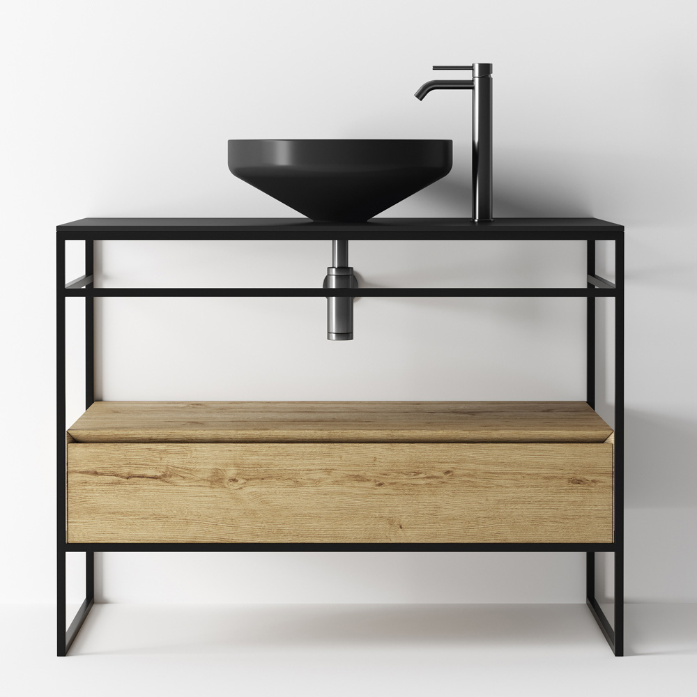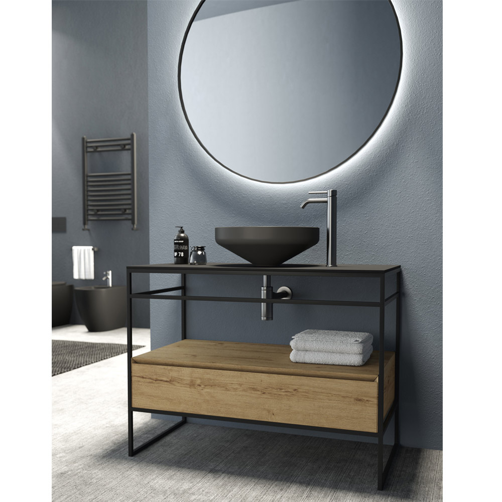 Kompozice koupelnového nábytku kompletně vyrobená v Itálii se skládá z keramického umyvadla v matné černé povrchové úpravě , podstavce se strukturou z matné černé nerezové oceli a horní desky z matné černé keramiky s praktickou zásuvkou v dubovém dřevě s řezem 45° a pomalým zavíráním. Kompozici dotváří kulaté podsvícené nástěnné zrcadlo s hliníkovým rámem s matnou černou povrchovou úpravou.
