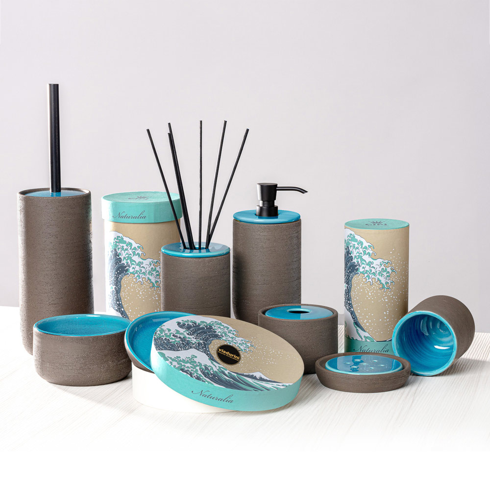 Koupelnové doplňky ze žáruvzdorné hlíny se smaltovanými detaily Made in Italy.