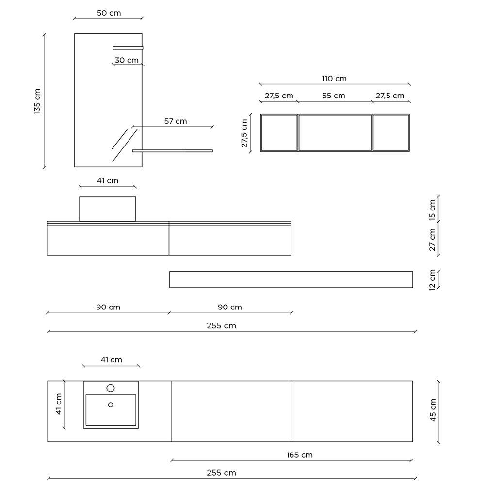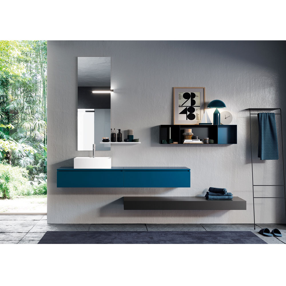 Koupelnová kompozice složená z moderního obdélníkového zrcadla s lampou, lesklého bílého keramického umyvadla na světle modrém melaminovém podstavci odolném proti poškrábání se 2 plně otevíracími zásuvkami s měkkým zavíráním a policí z MDF a HPL potažené antracitovou barvou.