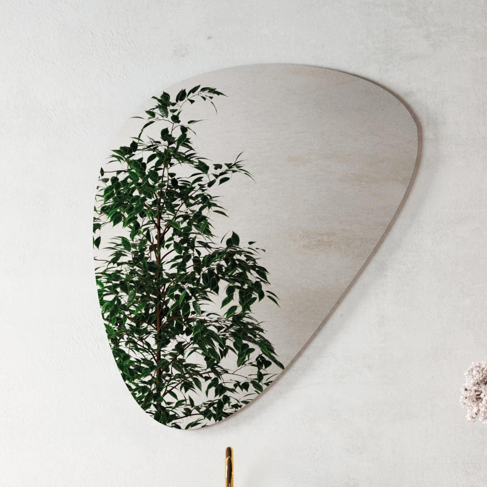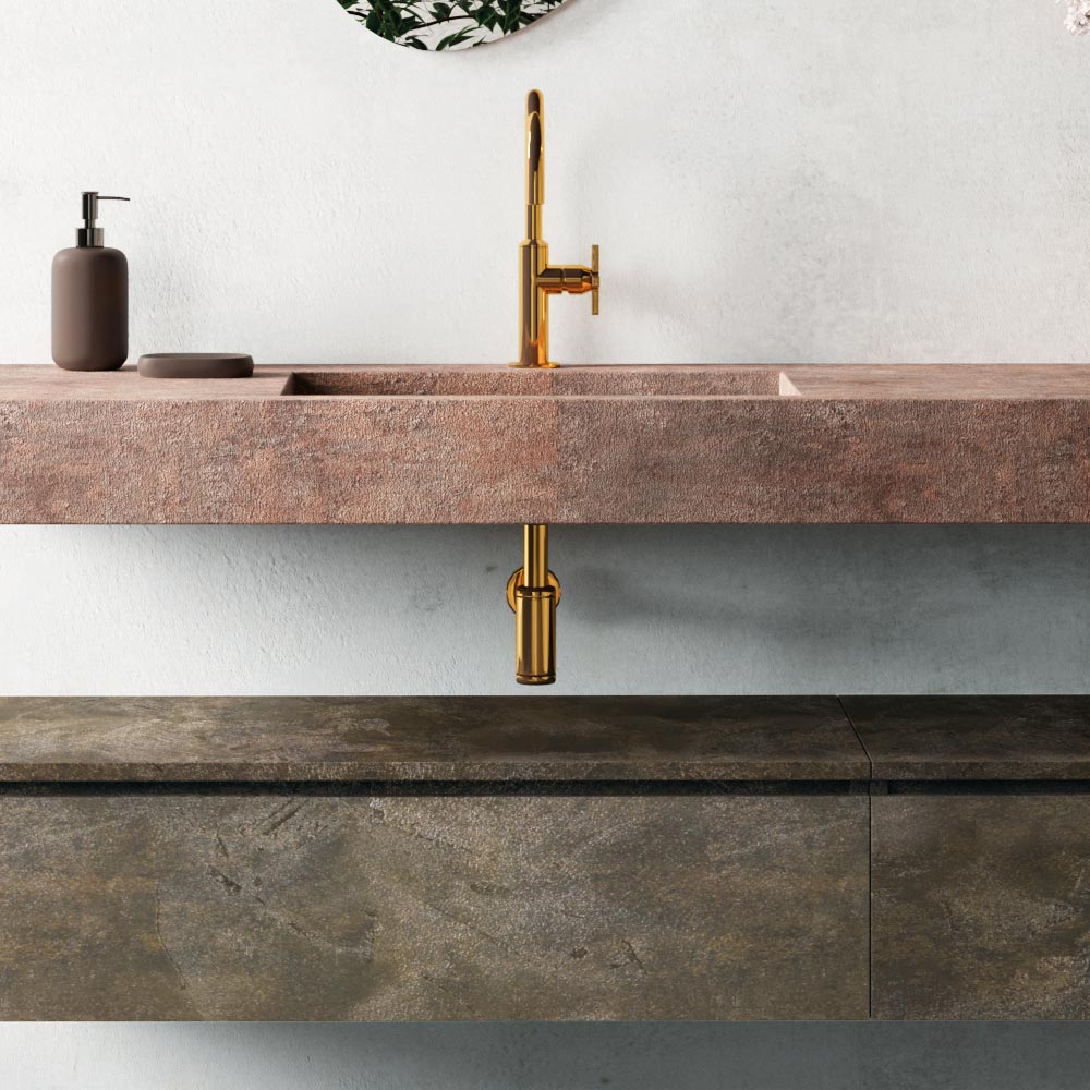 Koupelnová kompozice sestávající z moderního zrcadla a konzolového umyvadla v cortenové barvě lávový kámen barevný základ.