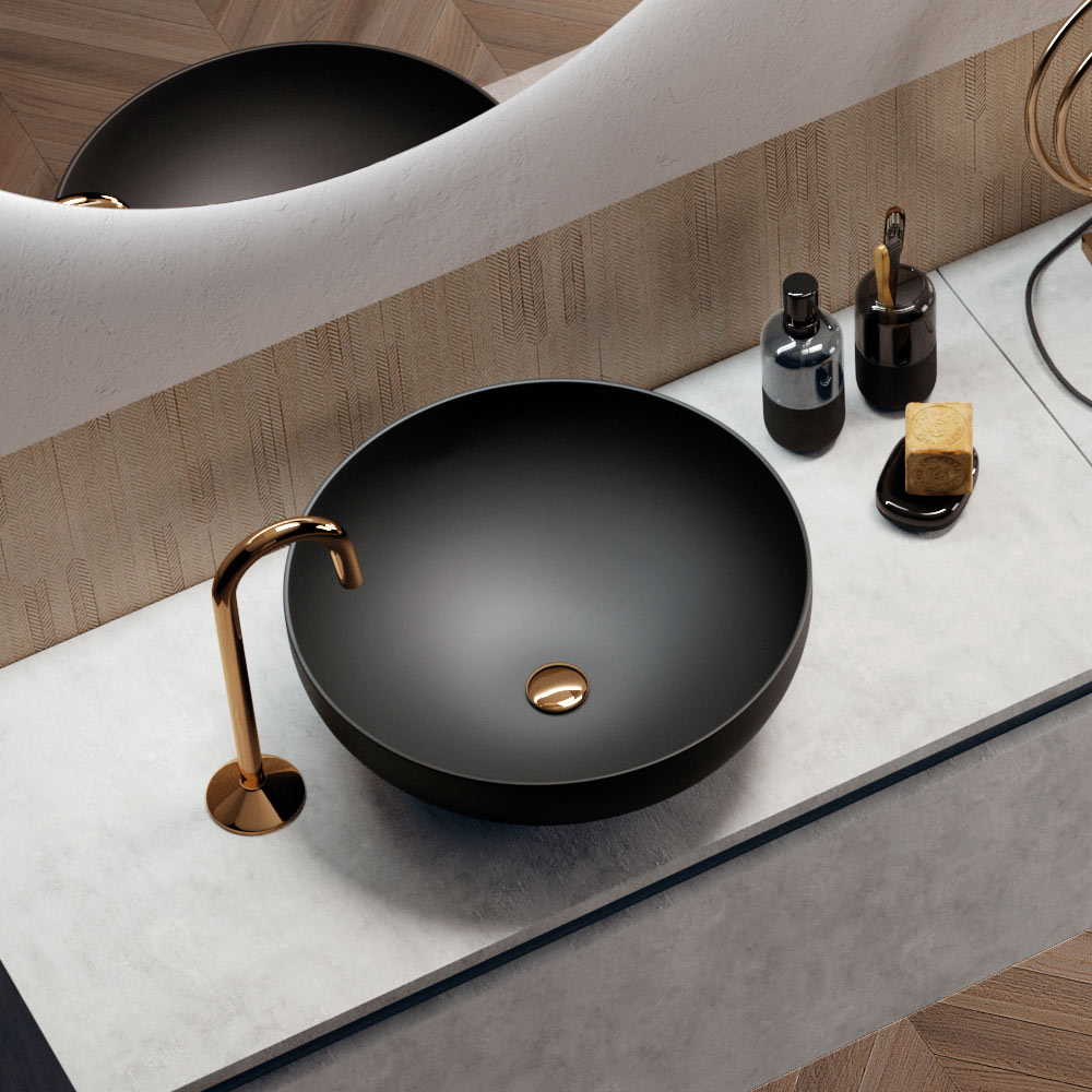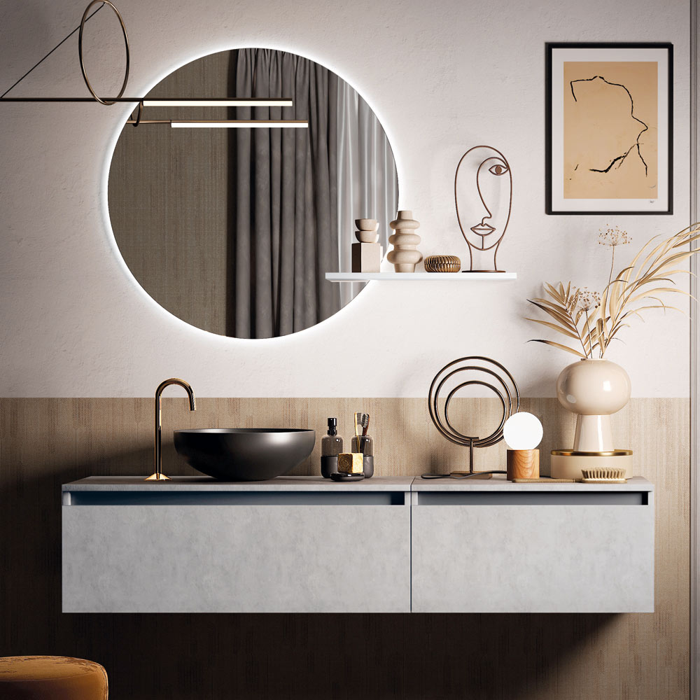 Koupelnová kompozice s lesklým pryskyřičným umyvadlem s lesklou antracitovou hranou, zrcadlem s ABS rámem s obvodovou LED, zavěšenou základnou z cementového melaminu odolného proti poškrábání se 2 plně vyjímatelnými zásuvkami a měkkým zavíráním.