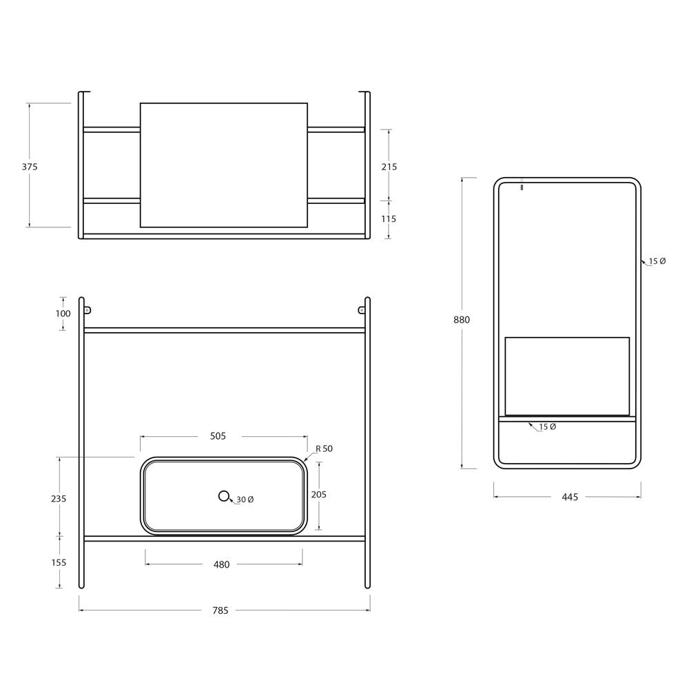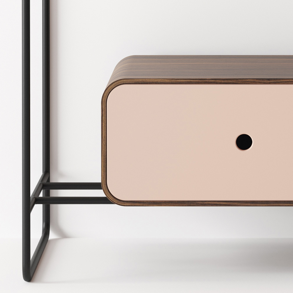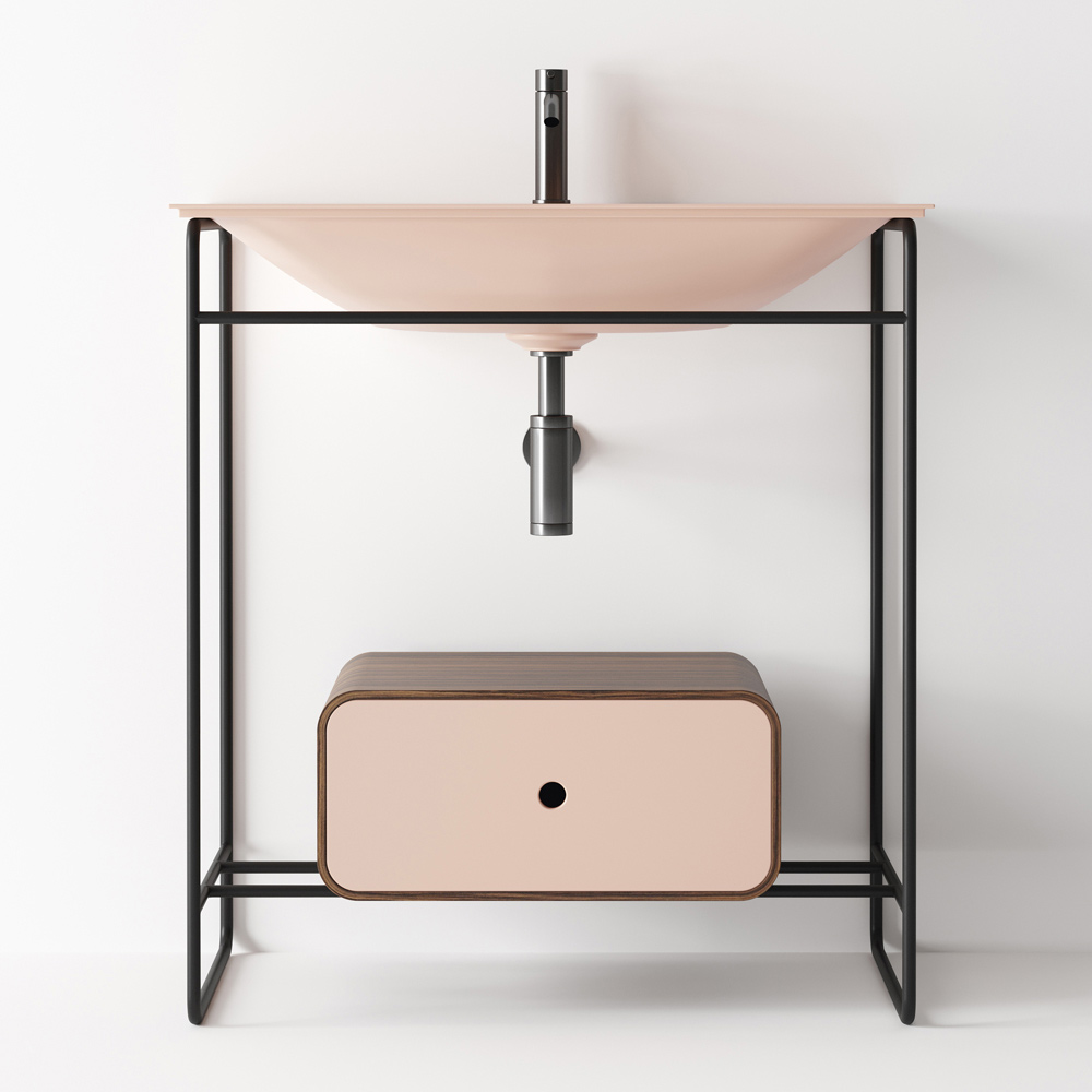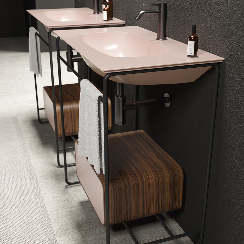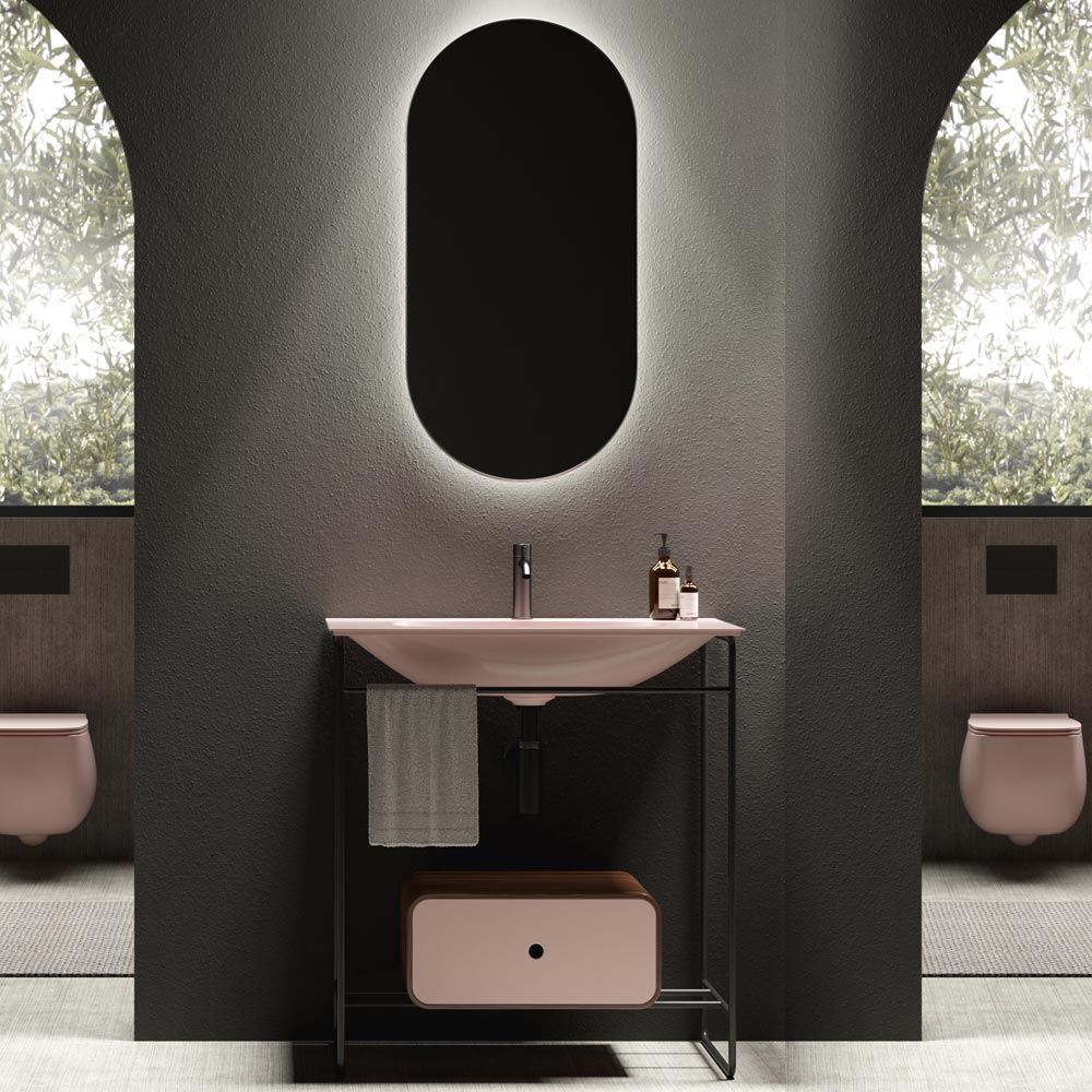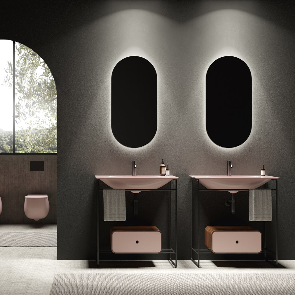 Kompozice koupelnové skříňky složená z keramického umyvadla s podstavcem a zrcadlem. Umyvadlo se vyznačuje důslednou geometrií a měkkými detaily, které vytvářejí rafinovanou a rafinovanou atmosféru. Základna má matně černou nerezovou konstrukci s ebenovou dřevěnou zásuvkou a čelem ve stejné barvě jako umyvadlo, zatímco oválné zrcadlo je podsvíceno matným černým hliníkovým rámem.