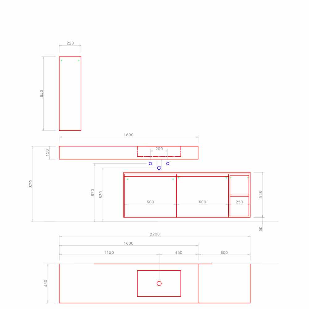 - skříňka s integrovaným umyvadlem v Teknorit h.15 bez přepadového otvoru, včetně otvoru pro baterii, včetně bezplatného odtoku odpadu L.160 X D.45 X H.12 cm