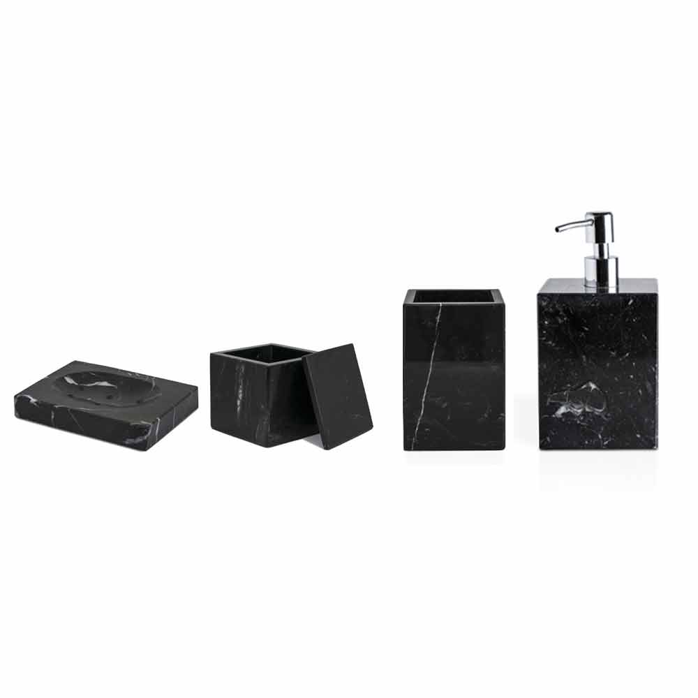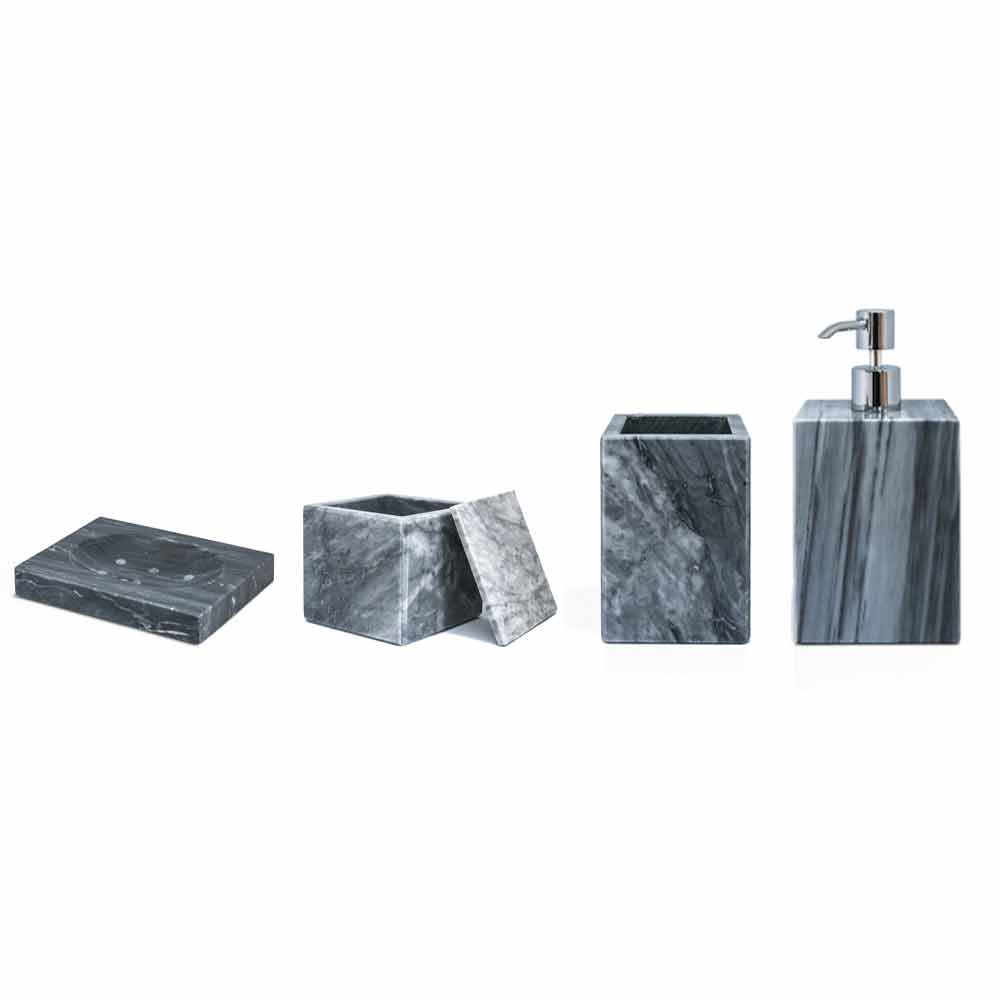 Skvělé složení koupelnového příslušenství, které zahrnuje: držák tekutého mýdla, mýdlo, držák na zubní kartáček a nádobku s víkem, je k dispozici ve 3 verzích.
