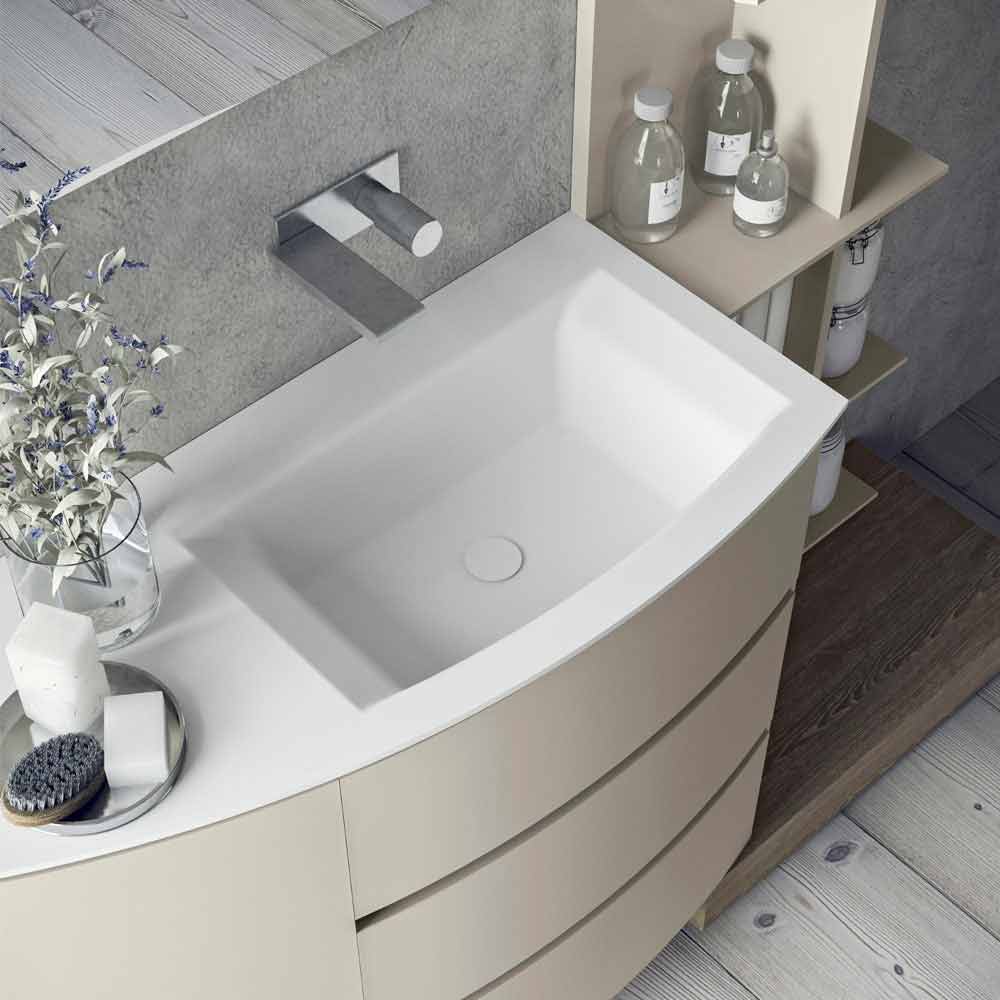 Scénu uzavírá vestavěné umyvadlo charakterizované dvěma bočními stranami, které jemně sestupují směrem k pánvi.