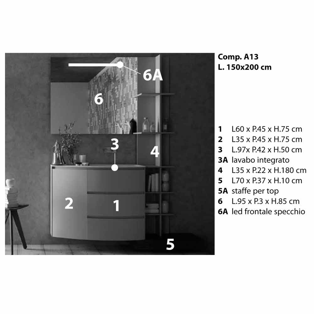 Moderní závěsná koupelnová kompozice, zakřivený a pravidelný design s otevřenými policemi, vyrobená v Itálii.