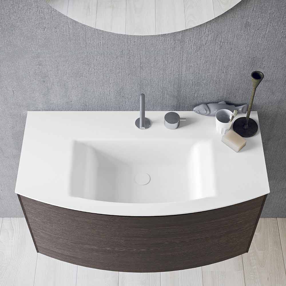 Souprava koupelnového nábytku se zakřivenými čely v unicorně páleném dubu HPL , integrované umyvadlo v matně bílé barvě Teknorit , otevřené jednotky v matně tmavě šedém lakovaném kovu.