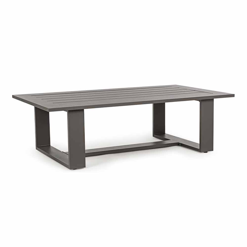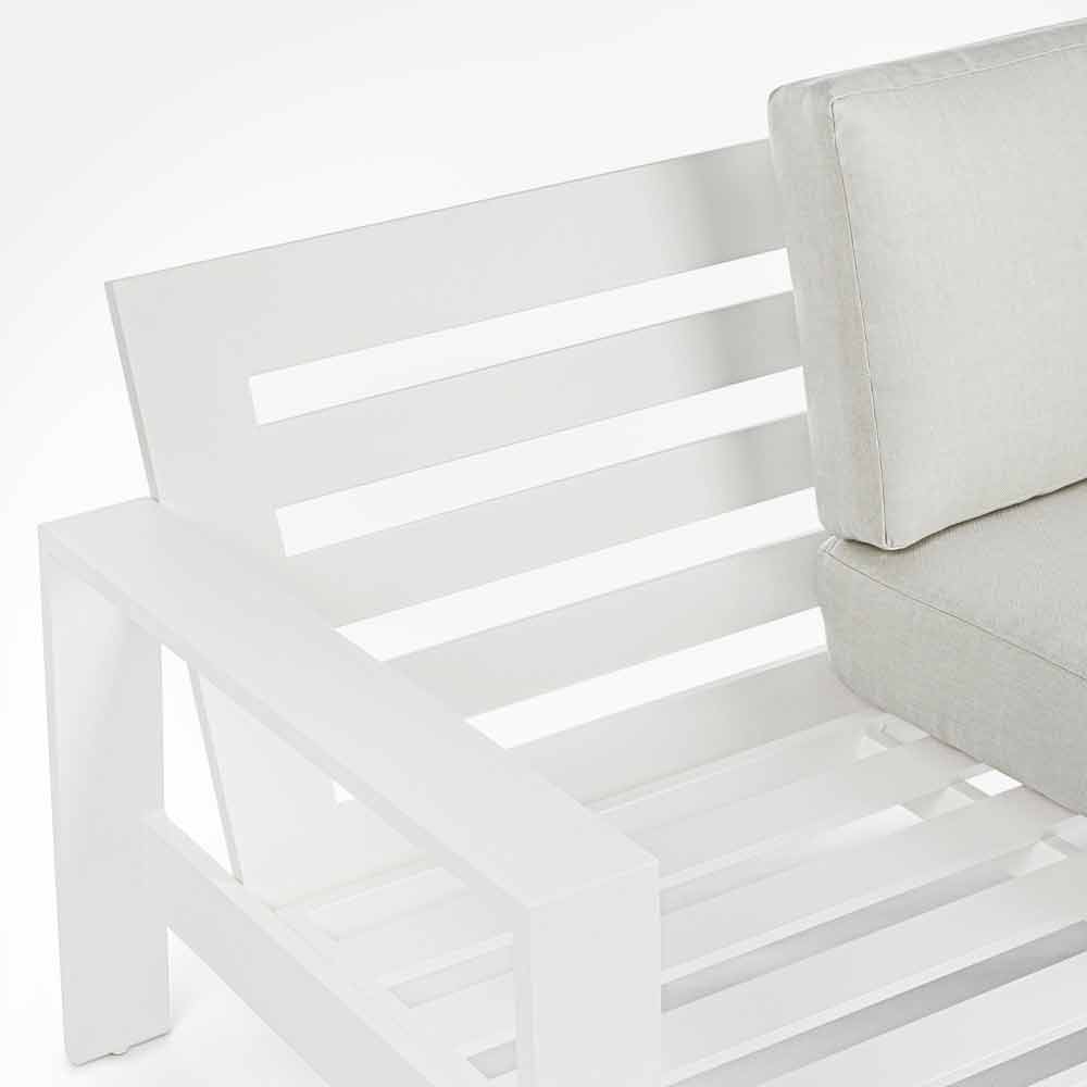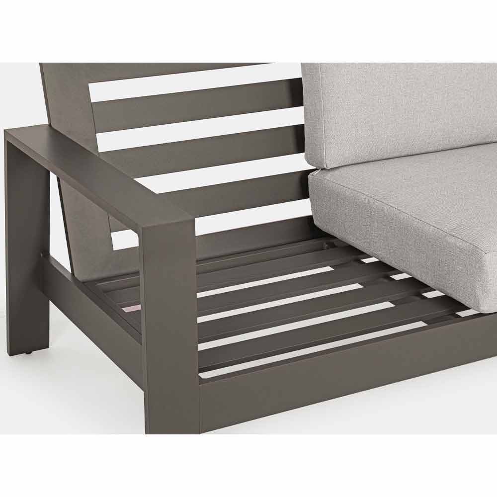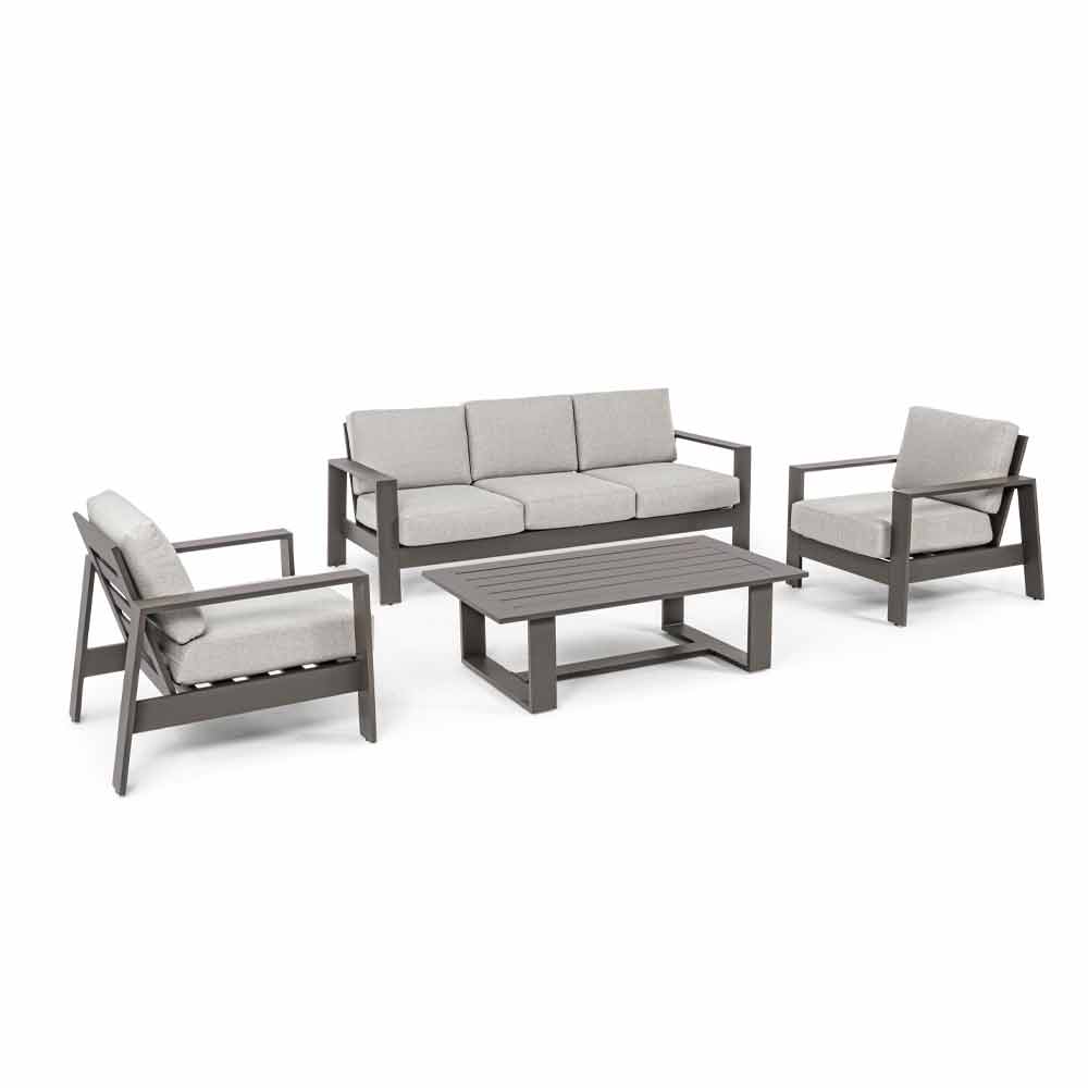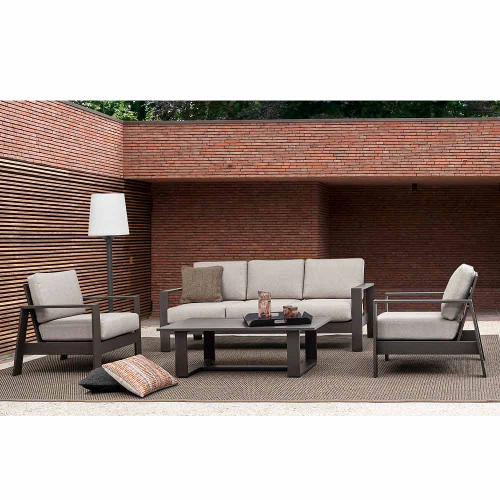 Venkovní salonek s pohovkou, křesly a hliníkovým konferenčním stolkem.