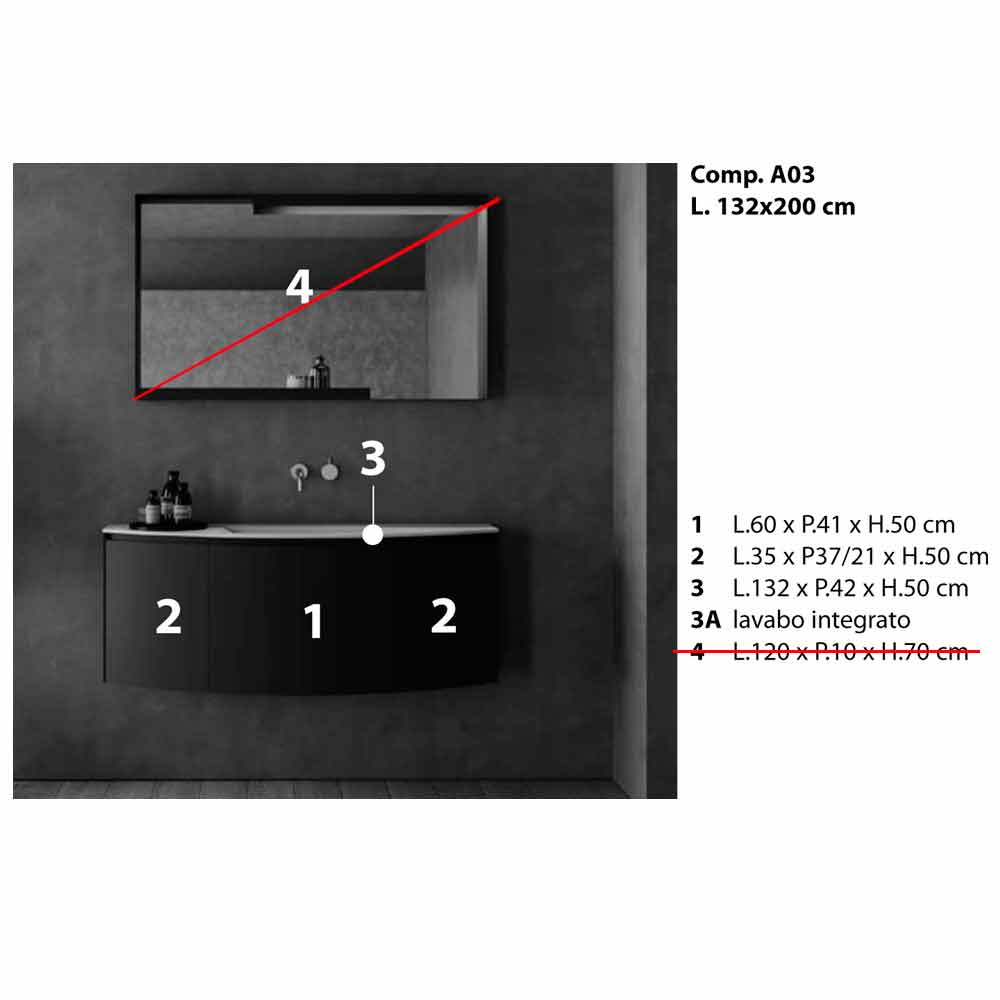 Závěsná koupelnová kompozice, křivočará as moderním designem, zcela vyrobená v Itálii.