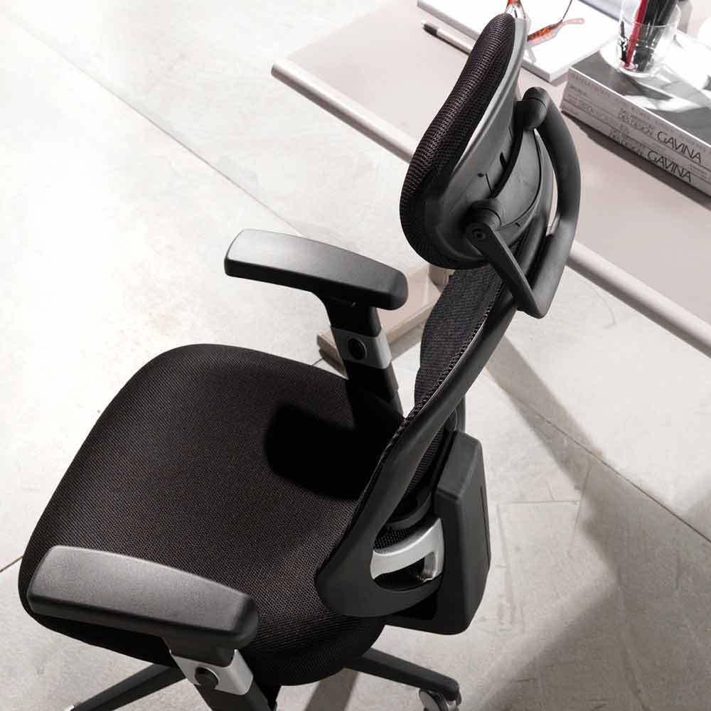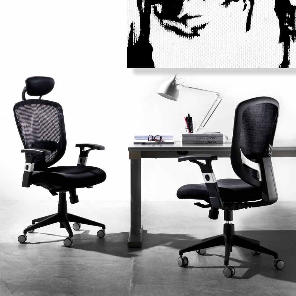 otočným sedadlem s plynovým výtahem, černá nylonová konstrukce s gumovými koly; opěradlo v černé mikroperforované tercnorete a sedadlo v černé puma. Je také vybaven bederní opěrkou, výškově nastavitelnými opěrkami rukou a hliníkovými detaily; je také k dispozici