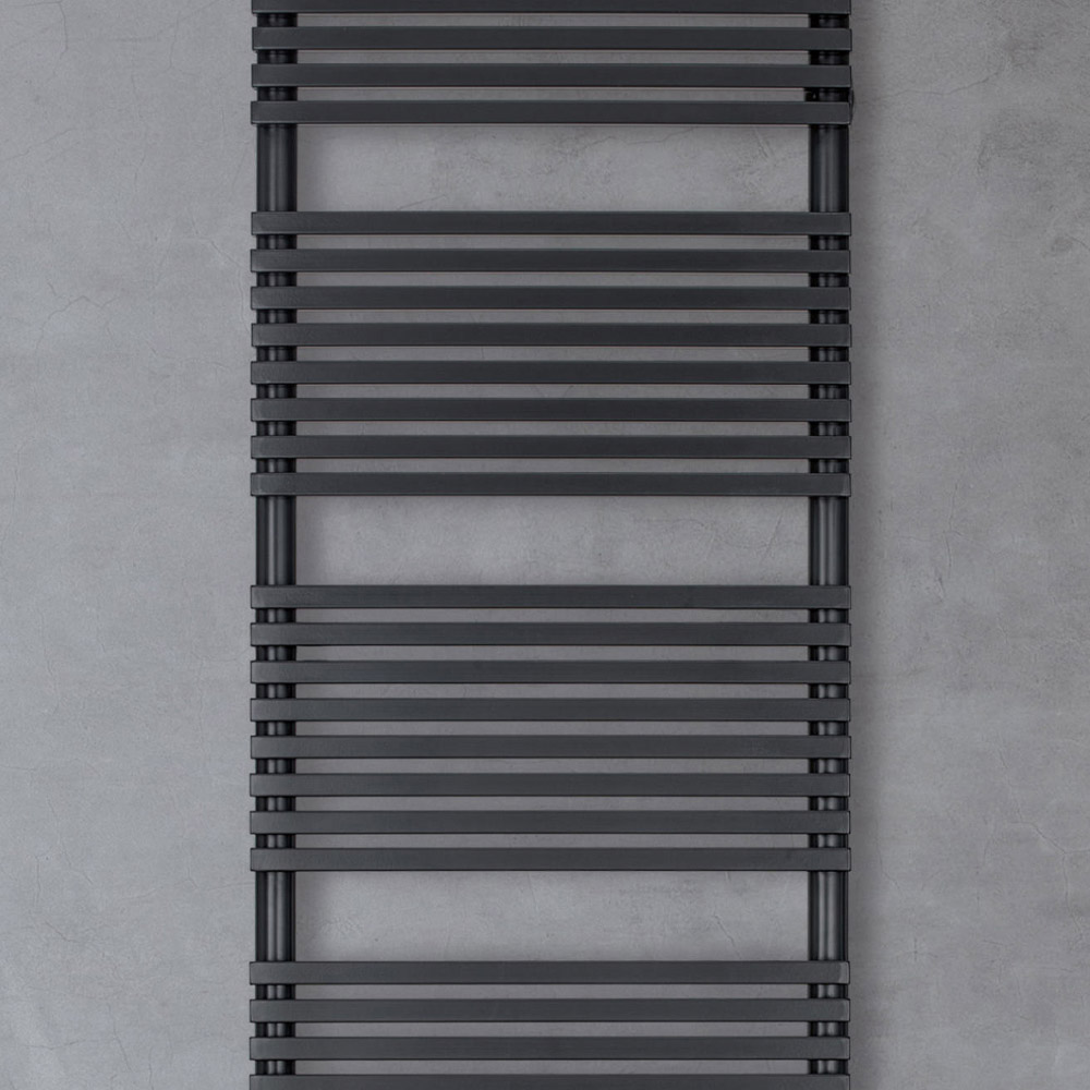 Hybridní vyhřívaný věšák na ručníky z uhlíkové oceli s černou povrchovou úpravou sestávající z řady horizontálních prvků o 2 cm čtvercové části navařených na vertikální rozdělovače o průměru 3,5 cm. Kompletně vyrobeno v Itálii včetně sady pro upevnění na stěnu, odvzdušňovacího ventilu a záslepky .