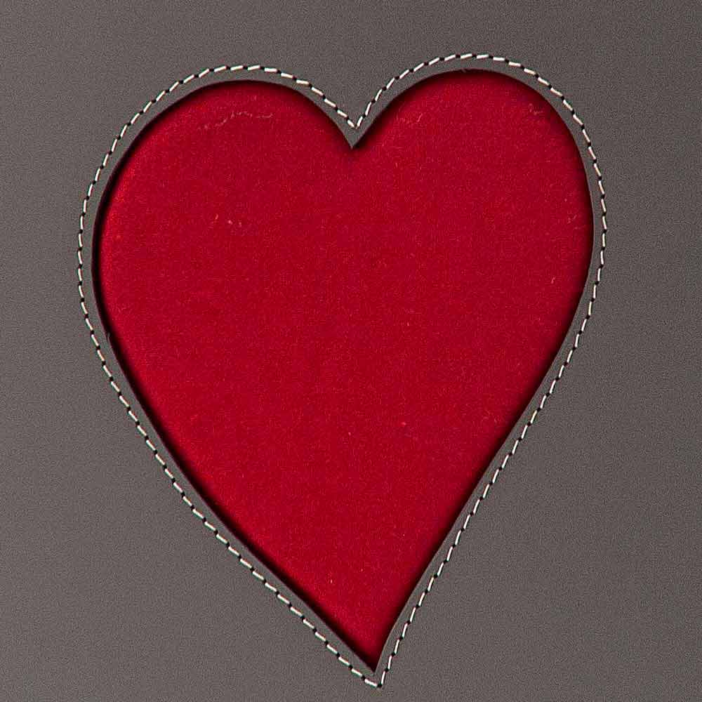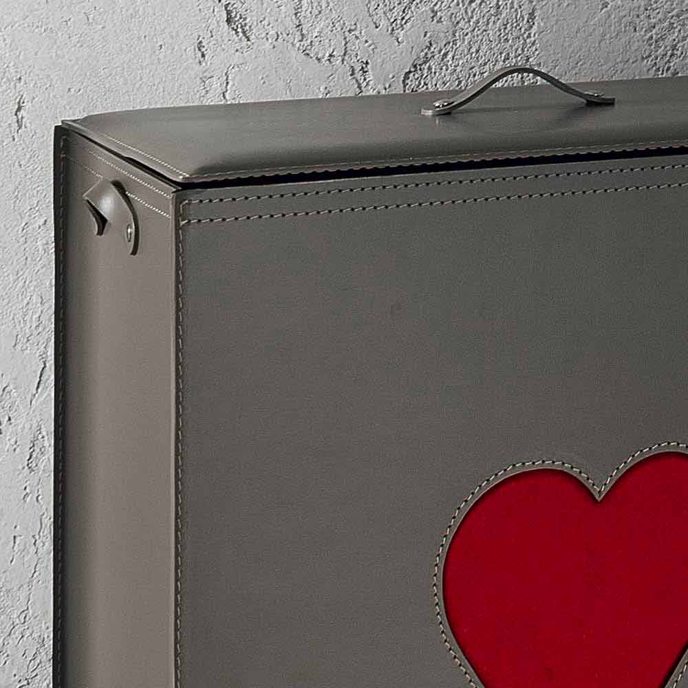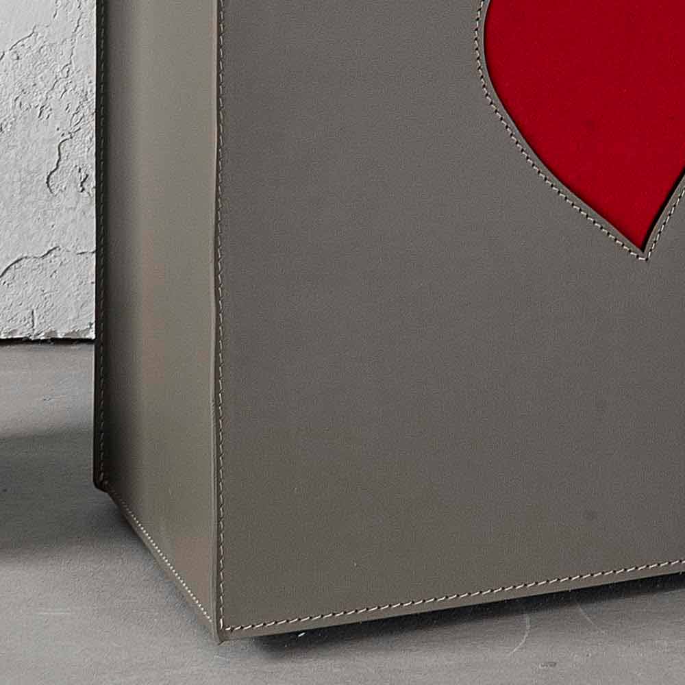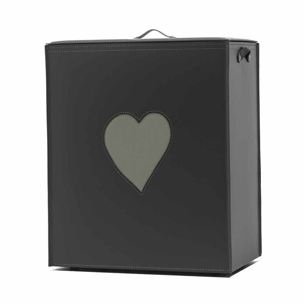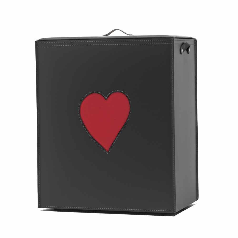 Obdélníkový koš na prádlo je zhotoven z regenerované kůže jak uvnitř, tak i venku, ve tvaru srdce je vybrán z červené nebo tupé barvy. Dno je vyrobeno z překližky, také pokryté kůží. Vybaveno praktickými gumovými nohami. Uvnitř je odnímatelná bavlněná taška.