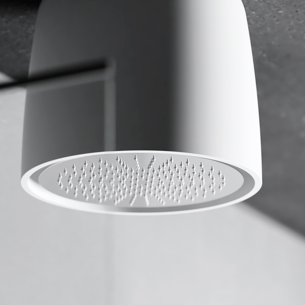 Made in Italy. Tato minimalistická designová sprchová hlavice je mistrovským dílem funkčnosti a moderního stylu . Matná bílá povrchová úprava a válcový tvar z ní dělají stylový ústřední bod každé moderní koupelny, zatímco velkorysý rozstřikovací otvor zajišťuje příjemný a relaxační zážitek ze sprchování, podobný přirozenému dešti. Jeho stropní instalace nabízí čistý a integrovaný vzhled, uvolňuje prostor a snižuje vizuální nepořádek. Každý aspekt této sprchové hlavice byl navržen s ohledem na pohodu a pohodlí a proměnil každodenní koupání v zážitek luxusu a relaxace . Je to perfektní doplněk pro každého, kdo chce povýšit svou rutinu osobní péče na okamžik čistého smyslového požitku .