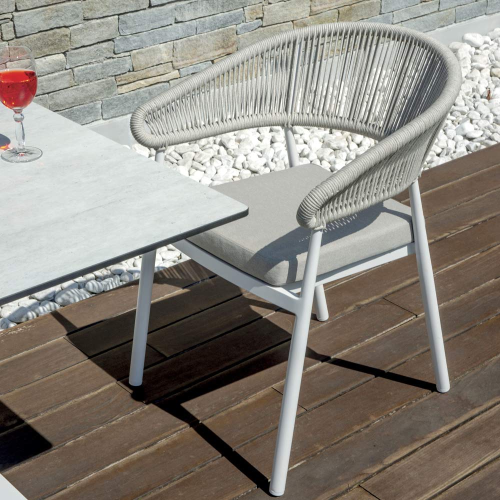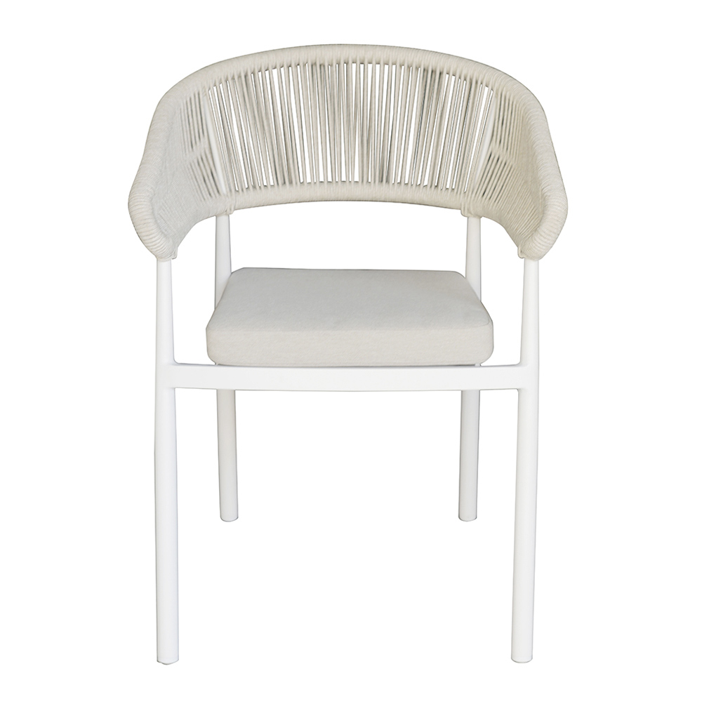 Dopřejte svému venkovnímu prostředí nádech vytříbeného stylu a praktičnosti s touto moderní designovou židlí. Provazové opěradlo dodává prvek ručně vyráběné elegance, zatímco hliníkový sedák s lamelami poskytuje pevnost a pohodlí, takže je ideální pro každodenní použití.