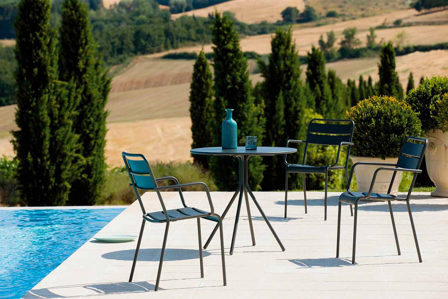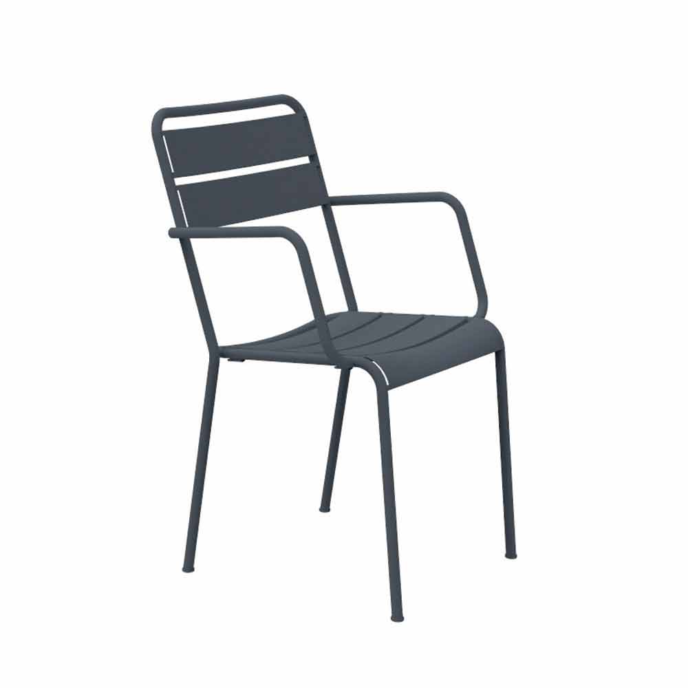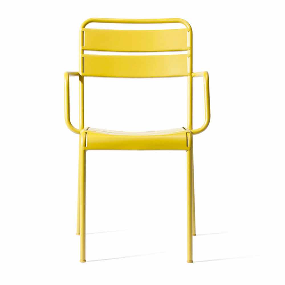 Stohovatelná venkovní židle s područkami nebo bez nich z práškově lakovaného pozinkovaného železa. Vyrobeno v Itálii, 4 kusy.
