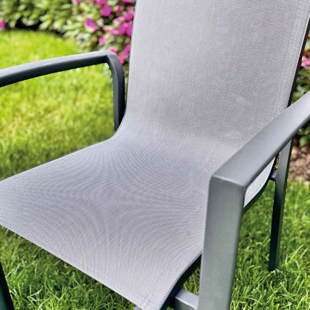 Lakovaný hliníkový rám je pevný, ale lehký, odolný vůči rzi a atmosférickým vlivům, ideální pro bydlení venku bez starostí. Sedák a opěrák z textilie , prodyšné a pružné technické tkaniny, zaručují ergonomický komfort i po hodinách používání a jemně se přizpůsobí tělu.