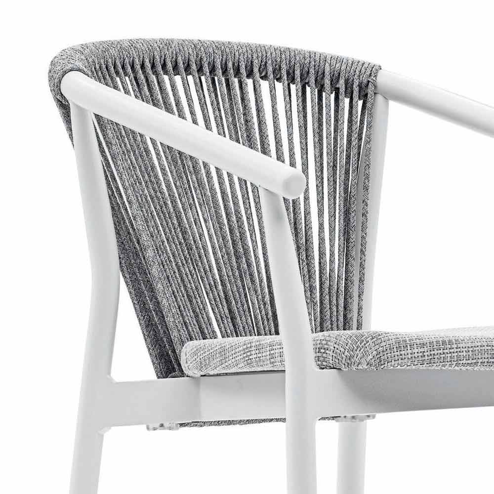 Moderní designová stohovatelná stolička s hliníkovou základnou a sedákem v bílé nebo popelově zbarvené technické tkanině.