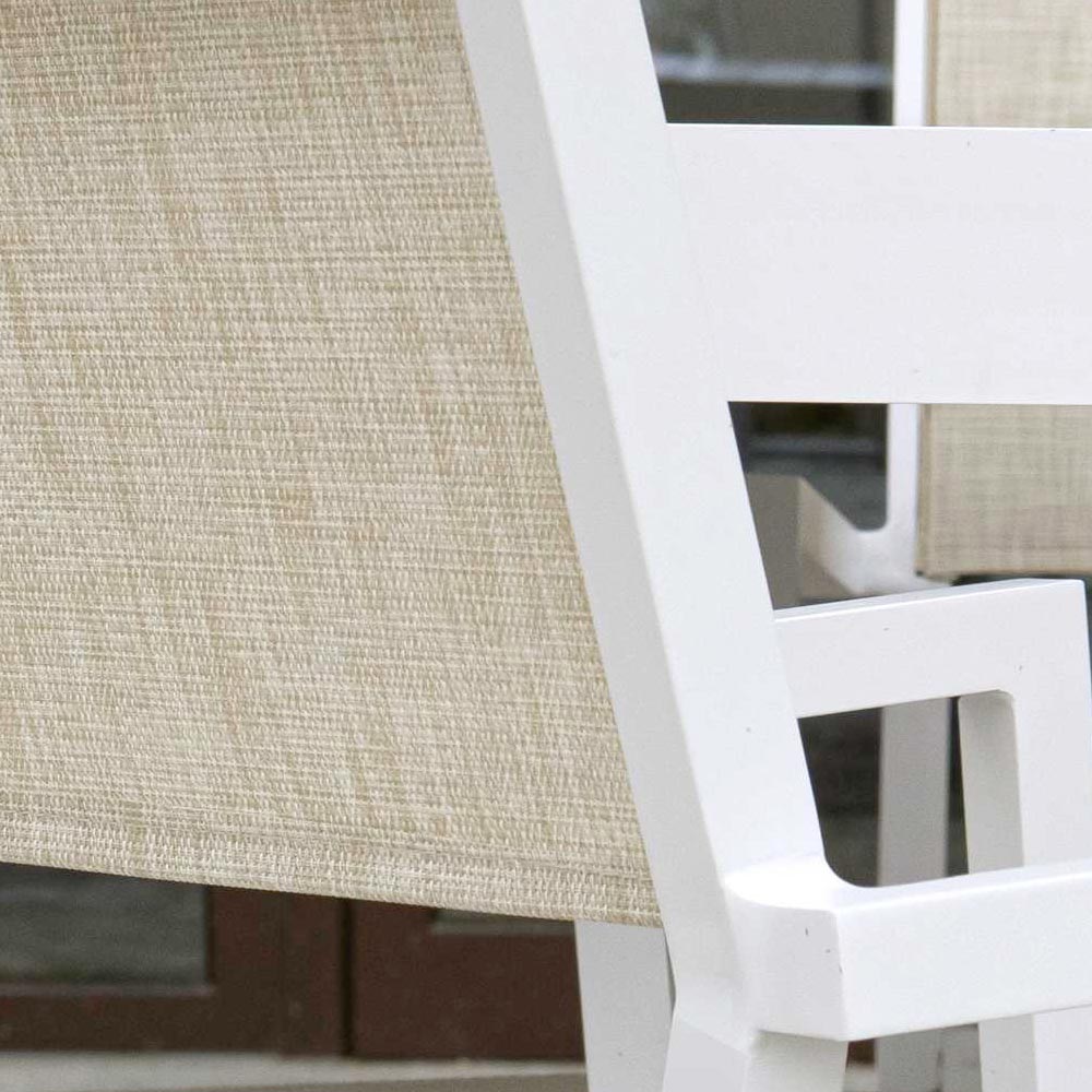 pevná konstrukce z matného bílého hliníku zaručuje trvanlivost a odolnost vůči povětrnostním vlivům a zachovává si svou krásu v průběhu času. Béžový potah z textilenu nejenže dodává dotek třídy díky své rafinované struktuře, ale také nabízí bezkonkurenční pohodlí díky své pružnosti a prodyšnosti.