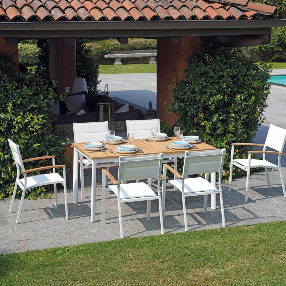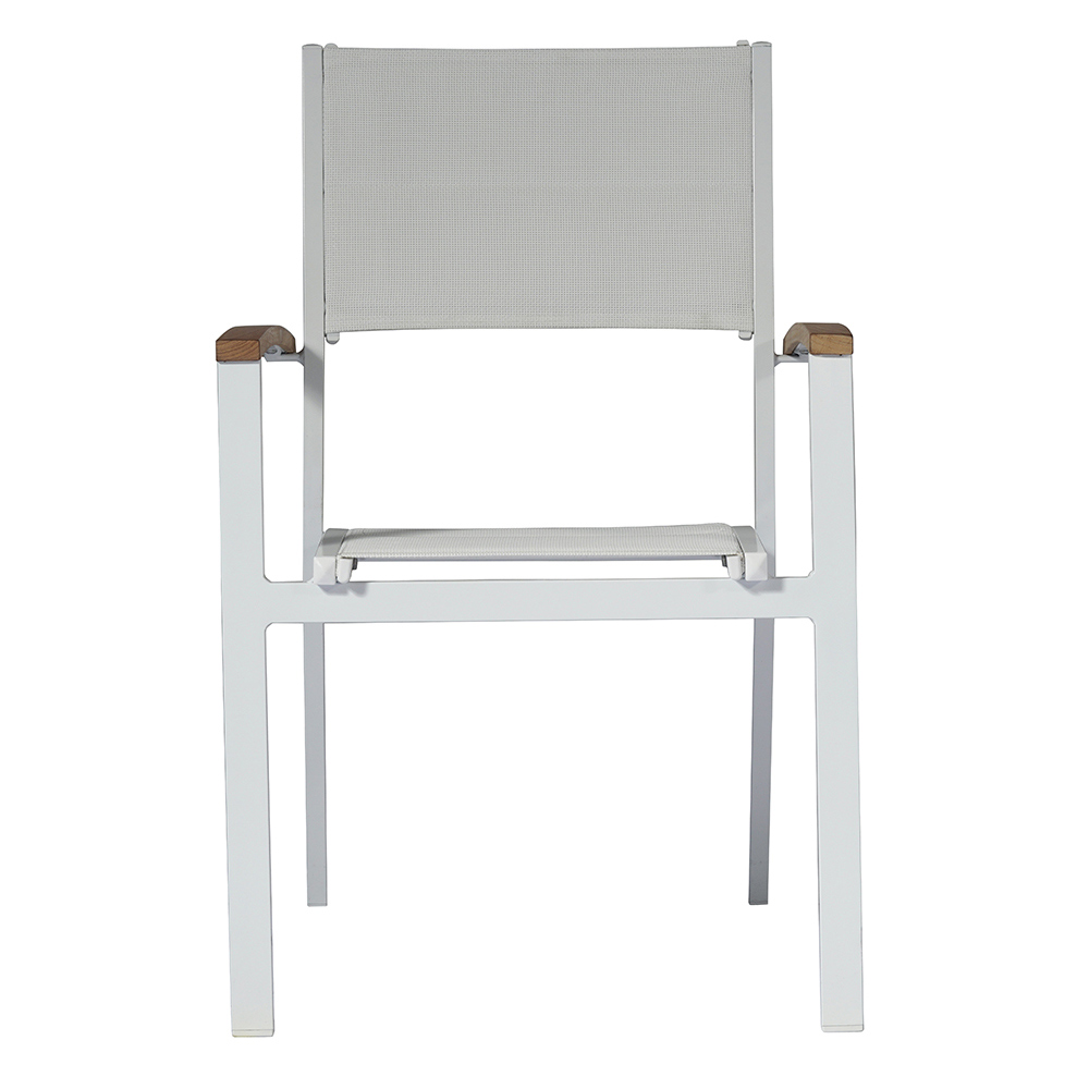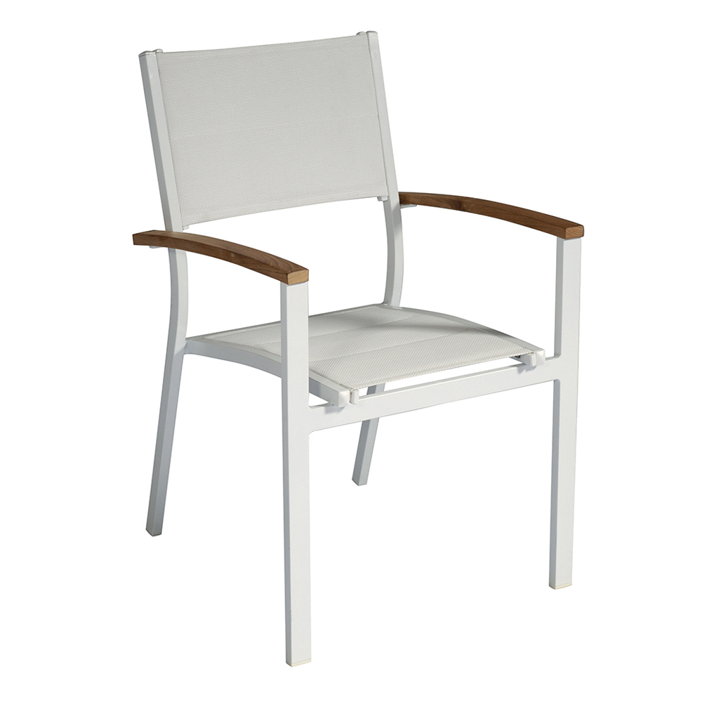 Stohovatelná venkovní židle s hliníkovou konstrukcí a sedákem z čalouněného textilu v barvě slonové kosti obohacené o elegantní teakové područky . Tato venkovní židle kombinuje design a jednoduchost , výsledek jednoduchých, ale odolných materiálů , které dávají život produktu s originálním a avantgardním designem, který dokonale doplní jakékoli prostředí.