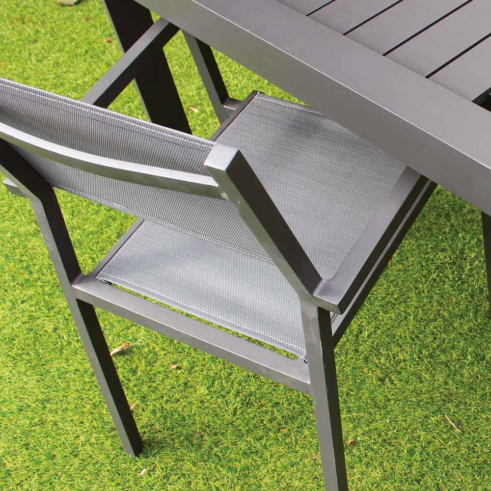 Sedák a opěrák z textilu , prodyšný a pohodlný technický materiál, zaručují ergonomický a příjemný zážitek ze sezení i v těch nejteplejších dnech. Barva dodává židli střízlivou eleganci , ideální pro doplnění jídelních nebo konferenčních stolků na zahradách, terasách nebo v uzavřených prostorách.