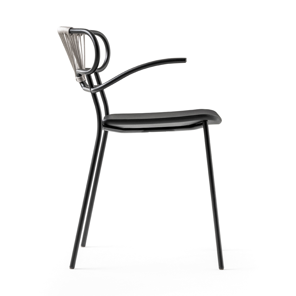 Židle do jídelny nebo kuchyně vyrobená v Itálii s černě lakovanou kovovou konstrukcí a šedým lanem s černě lakovaným sedákem z jasanového dřeva. Originální řešení v jednoduchosti, obohacené a jedinečné díky speciálnímu tvaru opěradla získaného zakřivením jedné kovové trubky a detailem vpleteným do lana, které dodává originální a extrovertní osobnost. Díky neutrálním povrchům a své podstatě je tato židle dokonalým řešením pro moderní prostředí, kde je vyžadován funkční a kreativní nápad, který nezůstane bez povšimnutí a zároveň zůstane diskrétní, a zároveň nabízí možnost stohování pro optimalizaci vašich prostor naplno.