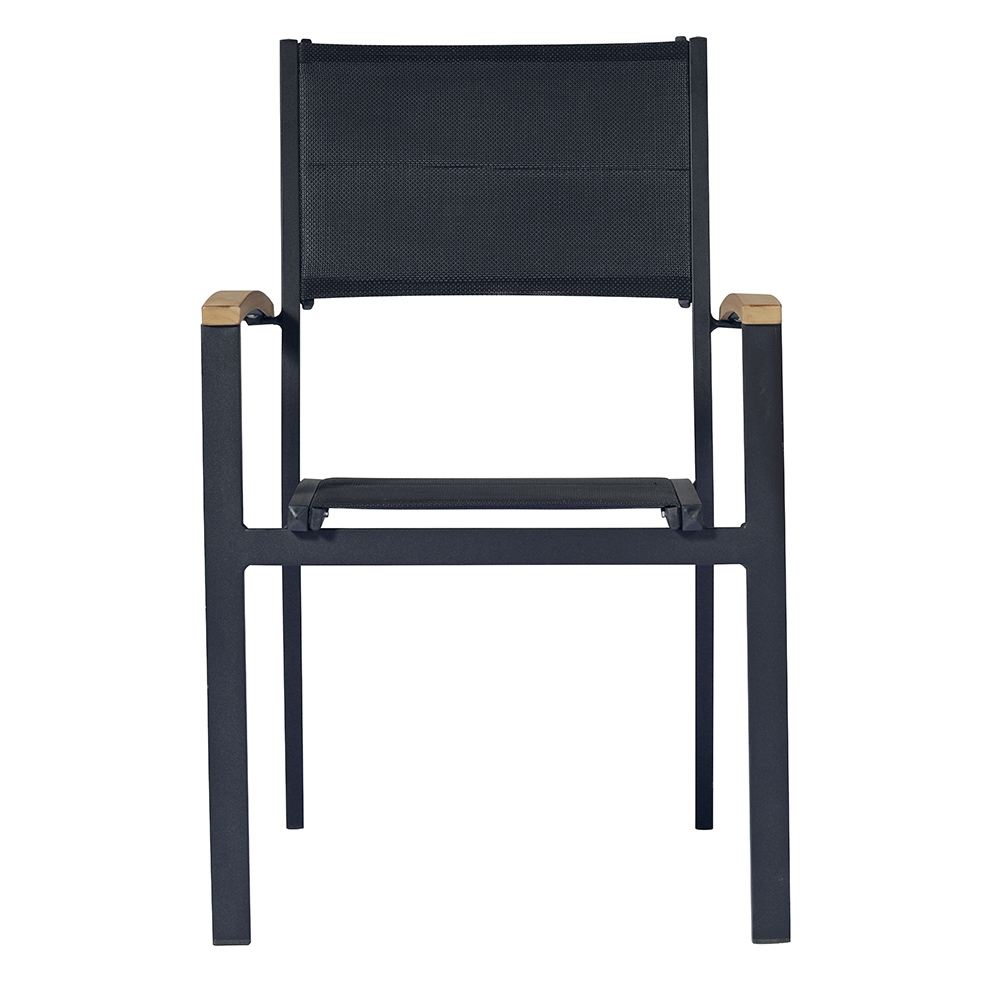 Zahradní židle z antracitově šedého hliníku se sedákem a opěradlem z černého čalouněného textilu s elegantními teakovými područkami . Tvary konstrukce se co nejlépe přizpůsobí siluetě těla a nabízejí skvělé pohodlí i díky praktickým područkám, které vám umožní udržet správnou a pohodlnou polohu . Ideální pro vybavení vašich venkovních prostor nádechem jedinečného stylu a silné moderní osobnosti .