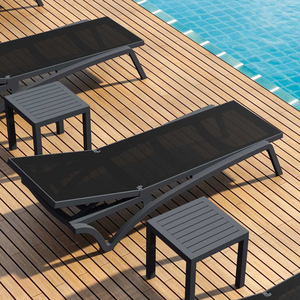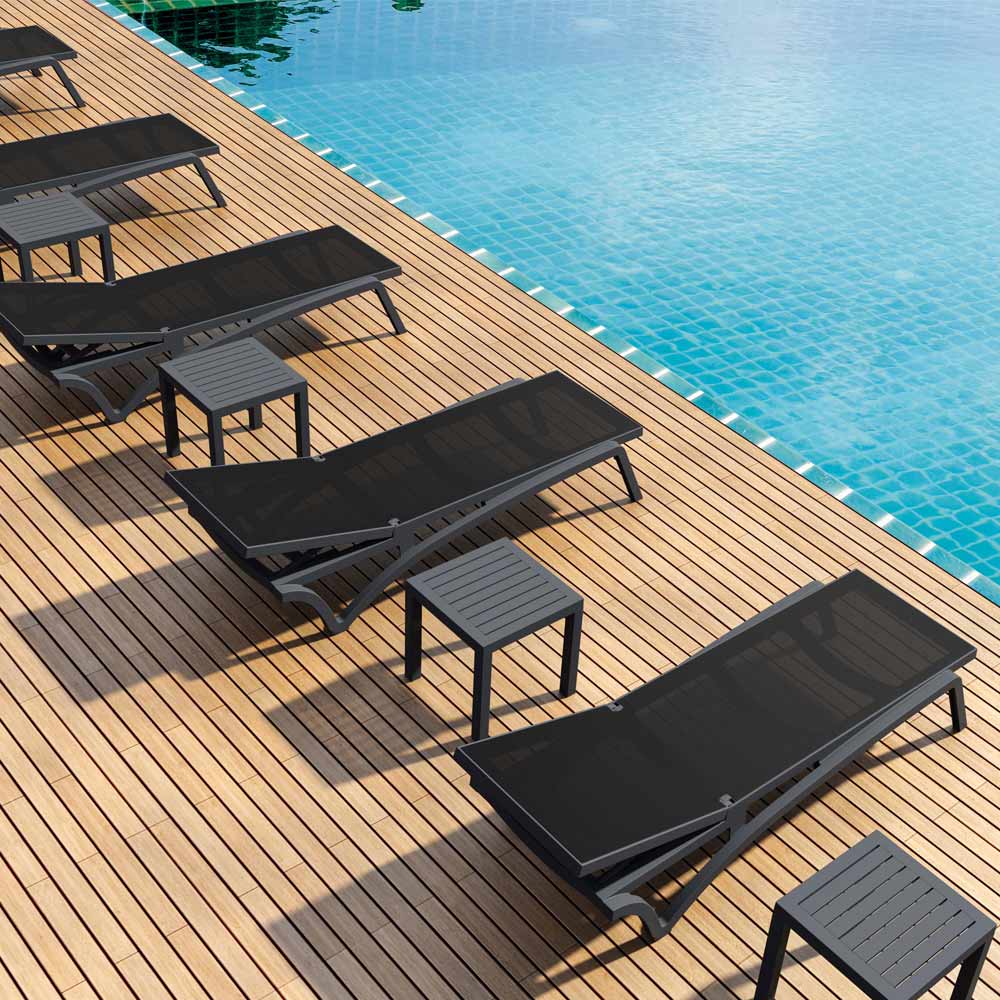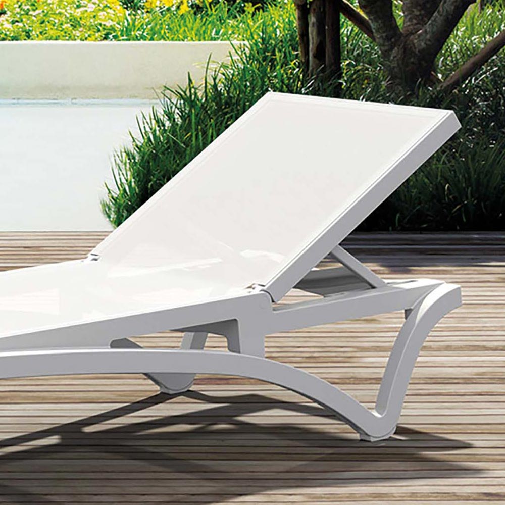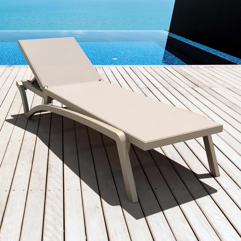 Venkovní lehátko s polypropylenovým rámem v kombinaci s barevnou textilní síťovinou s polohovatelným opěradlem až do 5 poloh, protiskluzovými nožičkami a kolečky.