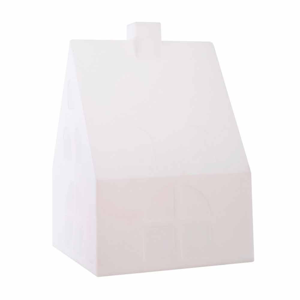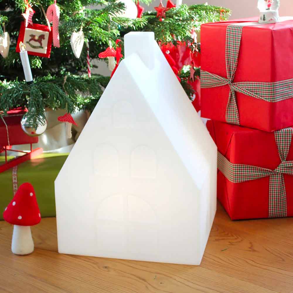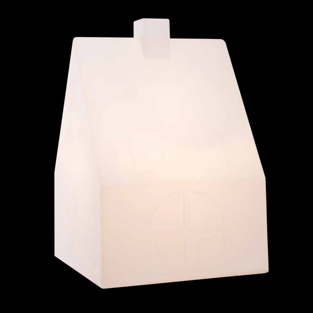 Stojací lampa ve tvaru domu z bílého polyethylenu, vícebarevné připojení LED, solární nebo E27 pro vnitřní nebo venkovní použití.