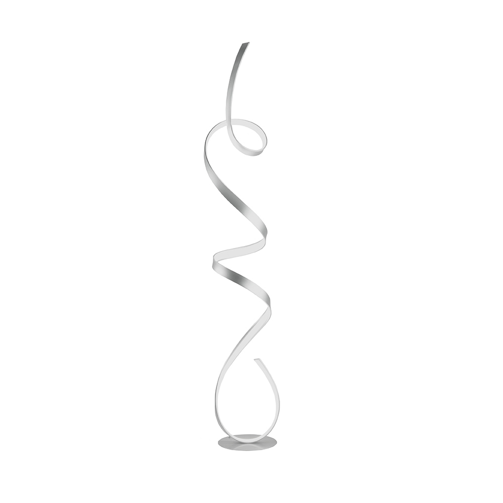 Stojací lampa se stříbrně lakovanou kovovou konstrukcí a LED světlem.