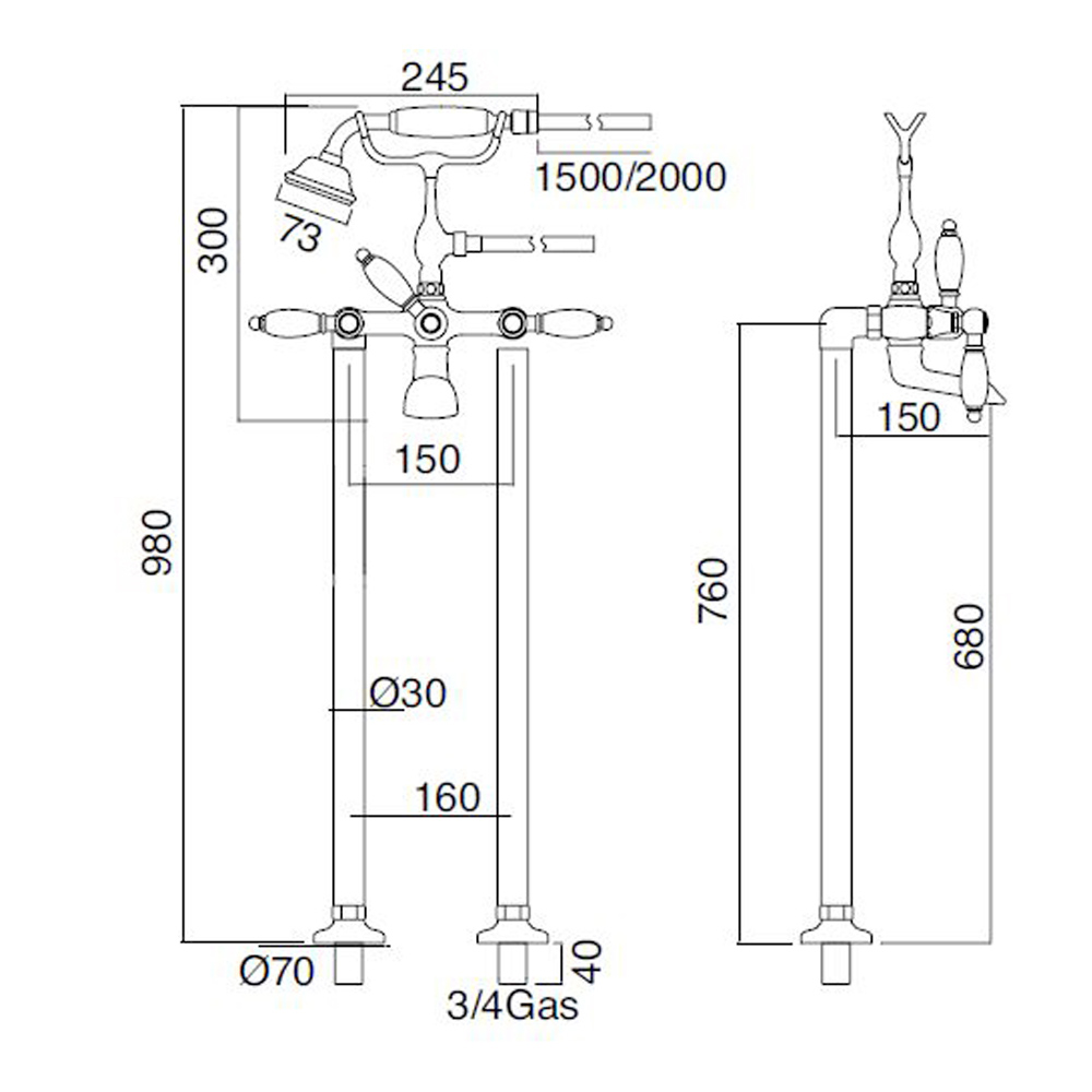 Podlahová vanová armatura s pákami v klasickém stylu, luxusní zboží vyrobené v Itálii.