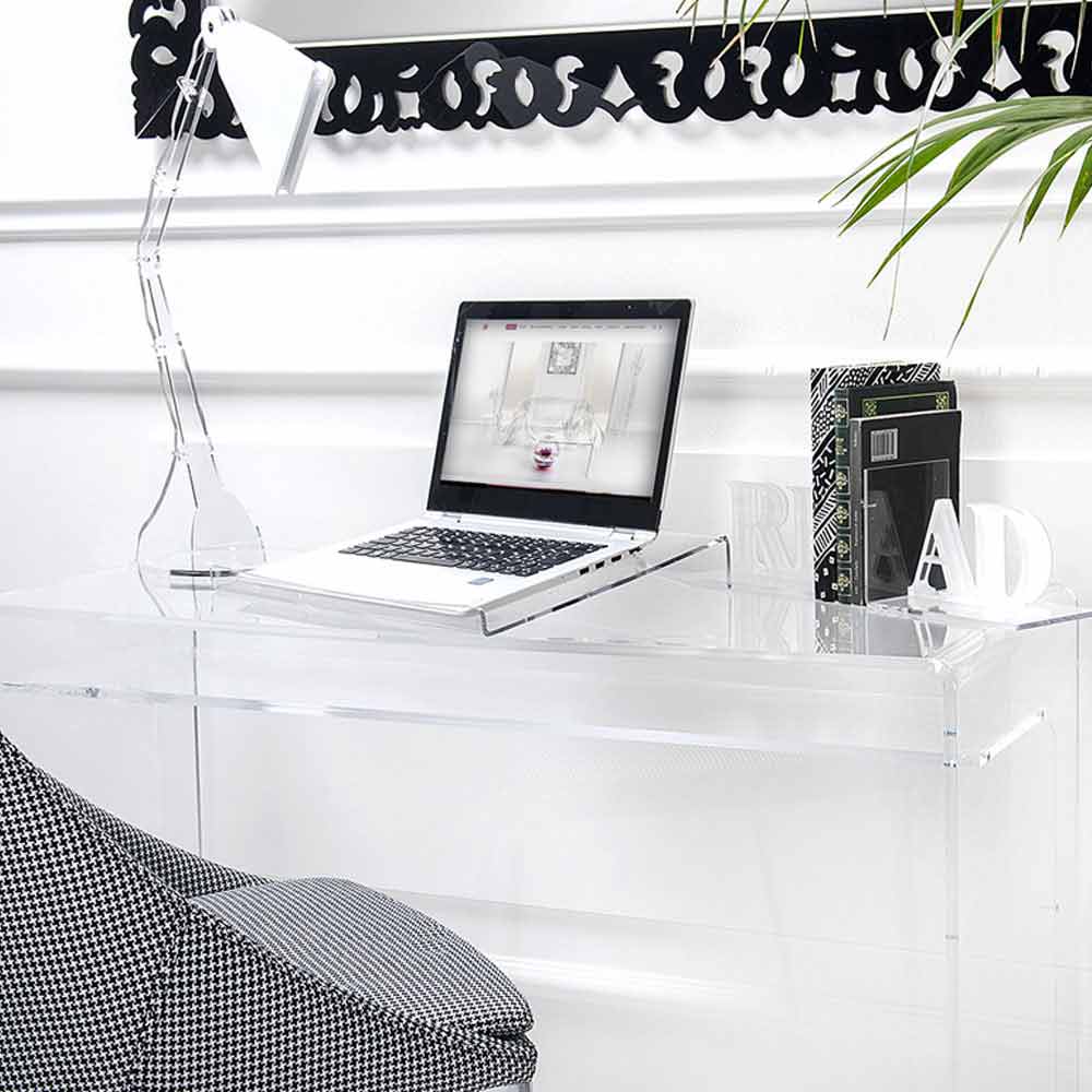 Vyrobeno z průhledného nebo uzeného plexiskla ze 100% panenského polymeru, je dokonalým spojencem pro pohodlnou práci z domova a může se prezentovat jako originální nápad na vánoční dárky pro ty, kteří chtějí praktický a funkční designový doplněk. Materiál, odolný a vysoce kvalitní, zaručuje stálý jas a lesk v průběhu času.