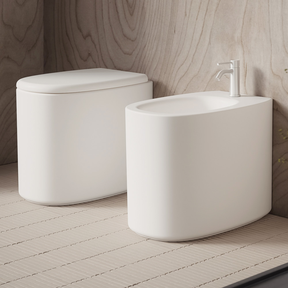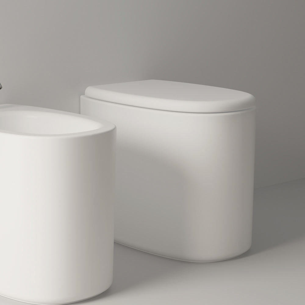 Tato stojící sanitární baterie, vyrobená z vysoce kvalitní keramiky , se vyznačuje kompaktním, obklopujícím tvarem, který vnáší do koupelny harmonii a zároveň zajišťuje pohodlí a každodenní praktičnost. Povrch elegantně odráží světlo a umocňuje pocit čistoty a pořádku.
