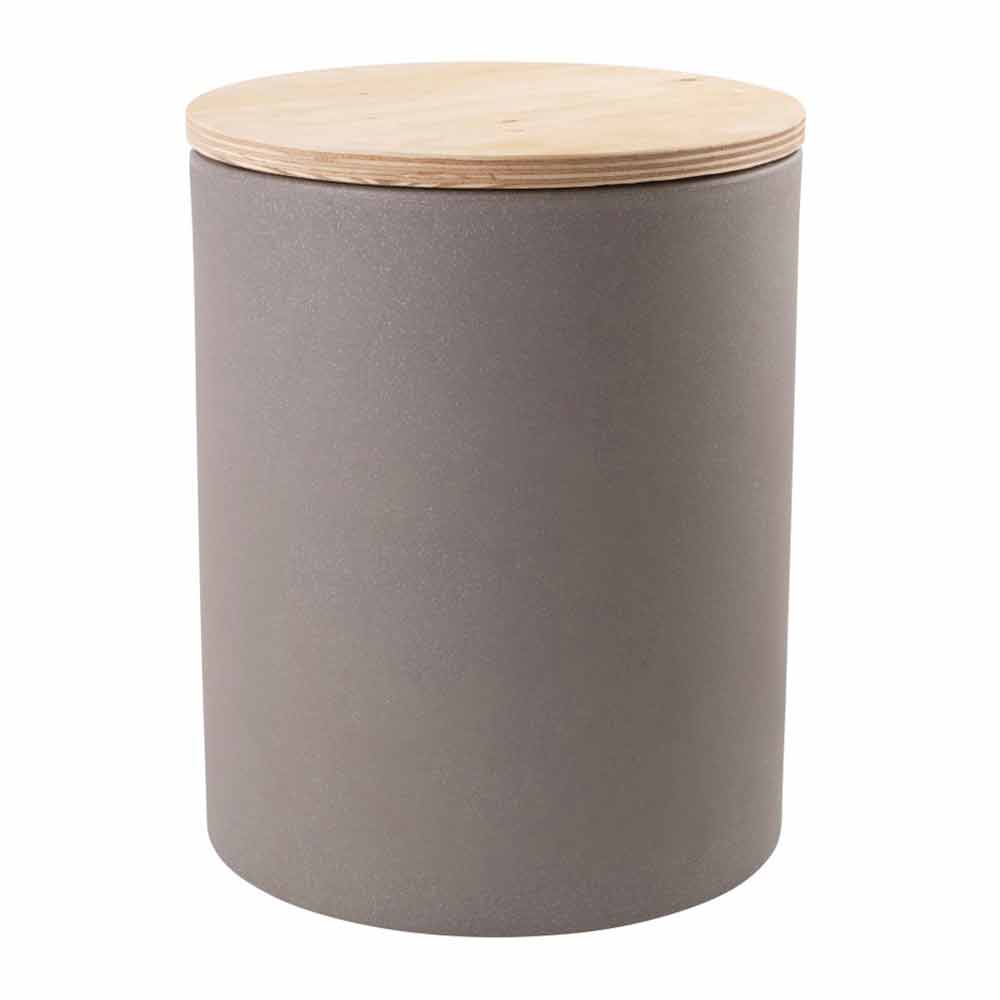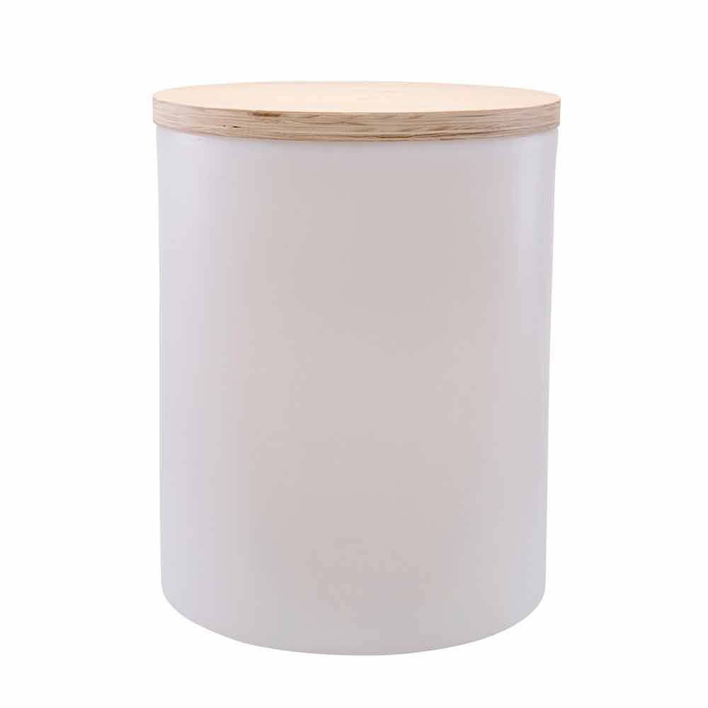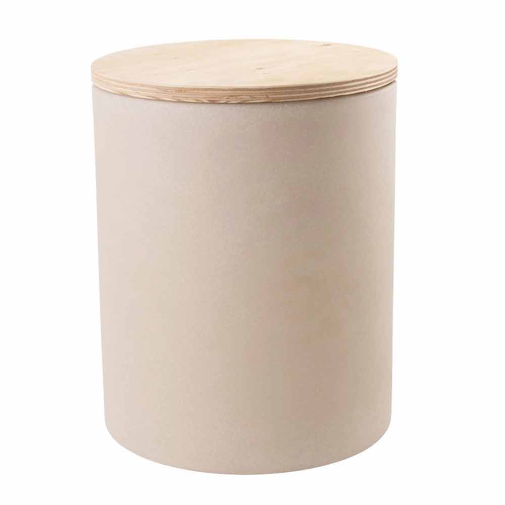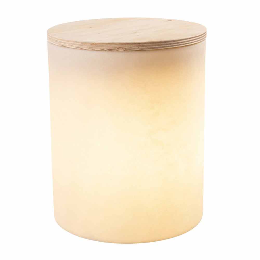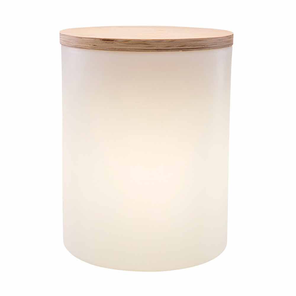 Světlý válcový konferenční stolek z barevného polyetylénu s dřevěnou deskou do zahrady nebo do moderního designového obývacího pokoje.