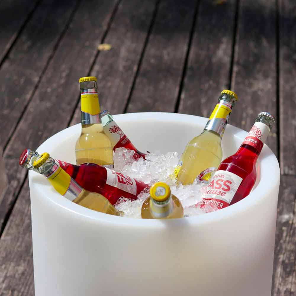 válcovitému tvaru s dřevěnou deskou je vhodný jako sedadlo, zatímco inteligentní drenážní systém je vhodný také jako světelný hrnec pro rostliny.
