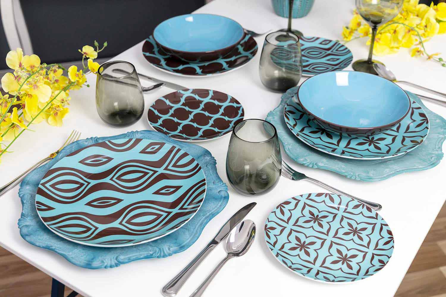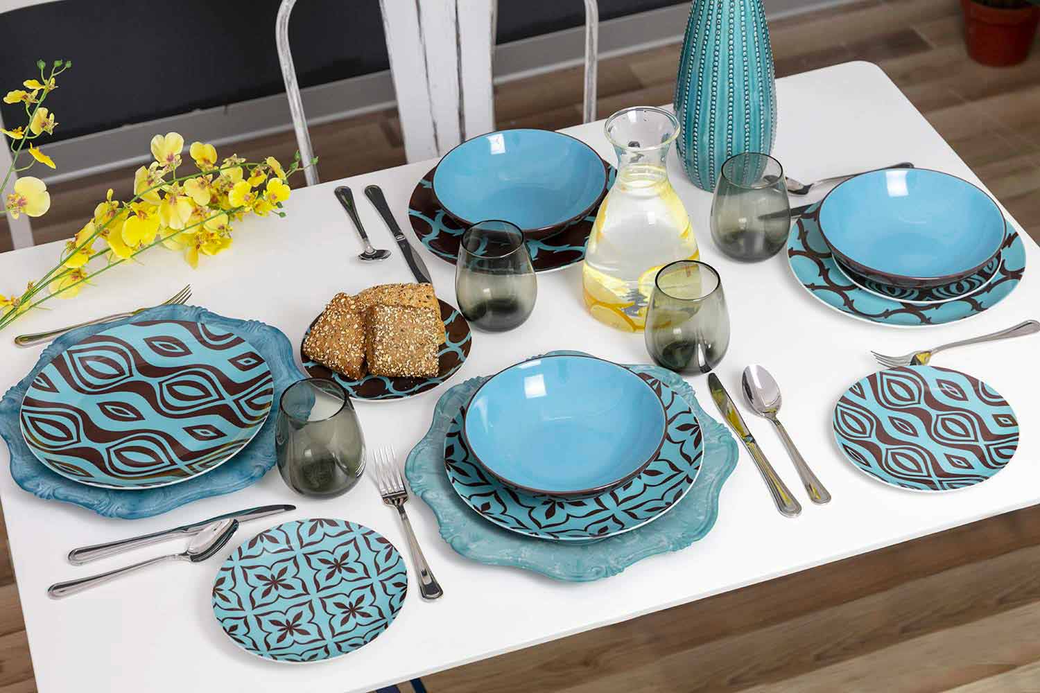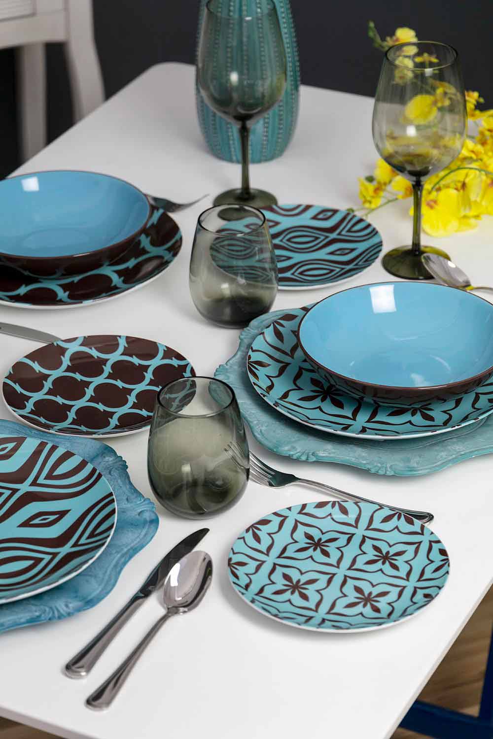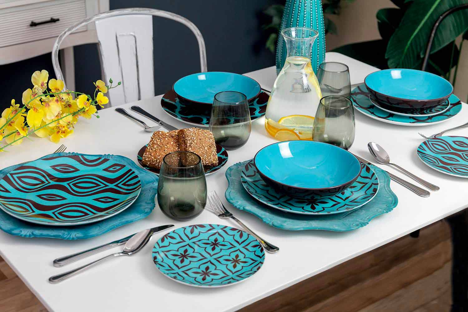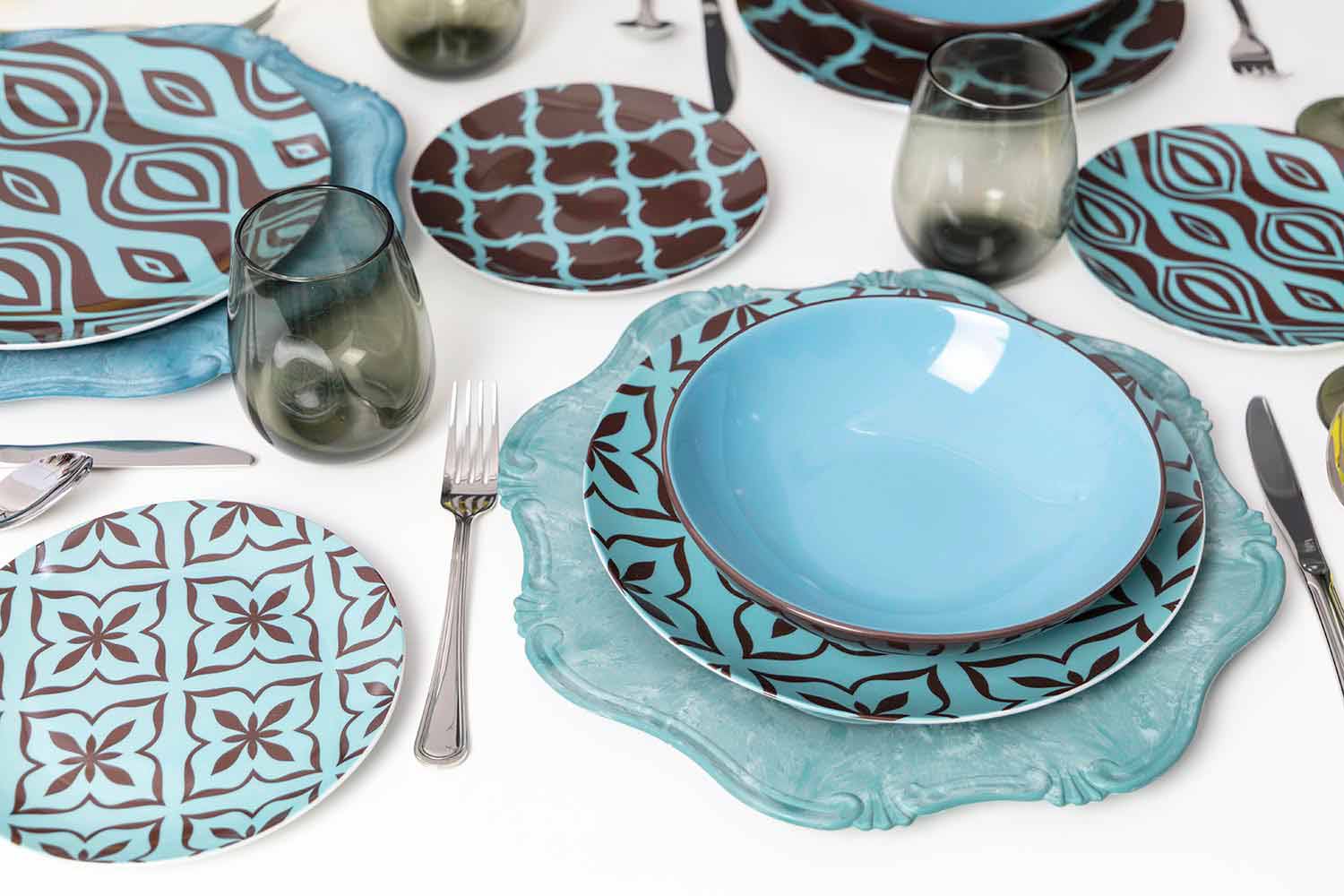 Elegance a lehkost rozlišují ploché talíře a ovocné talíře, vyrobené z jemného bílého porcelánu, na kterém je nalepena nálepka; glazovaná kamenina ze šesti polévkových talířů na druhé straně přináší funkčnost stolu: