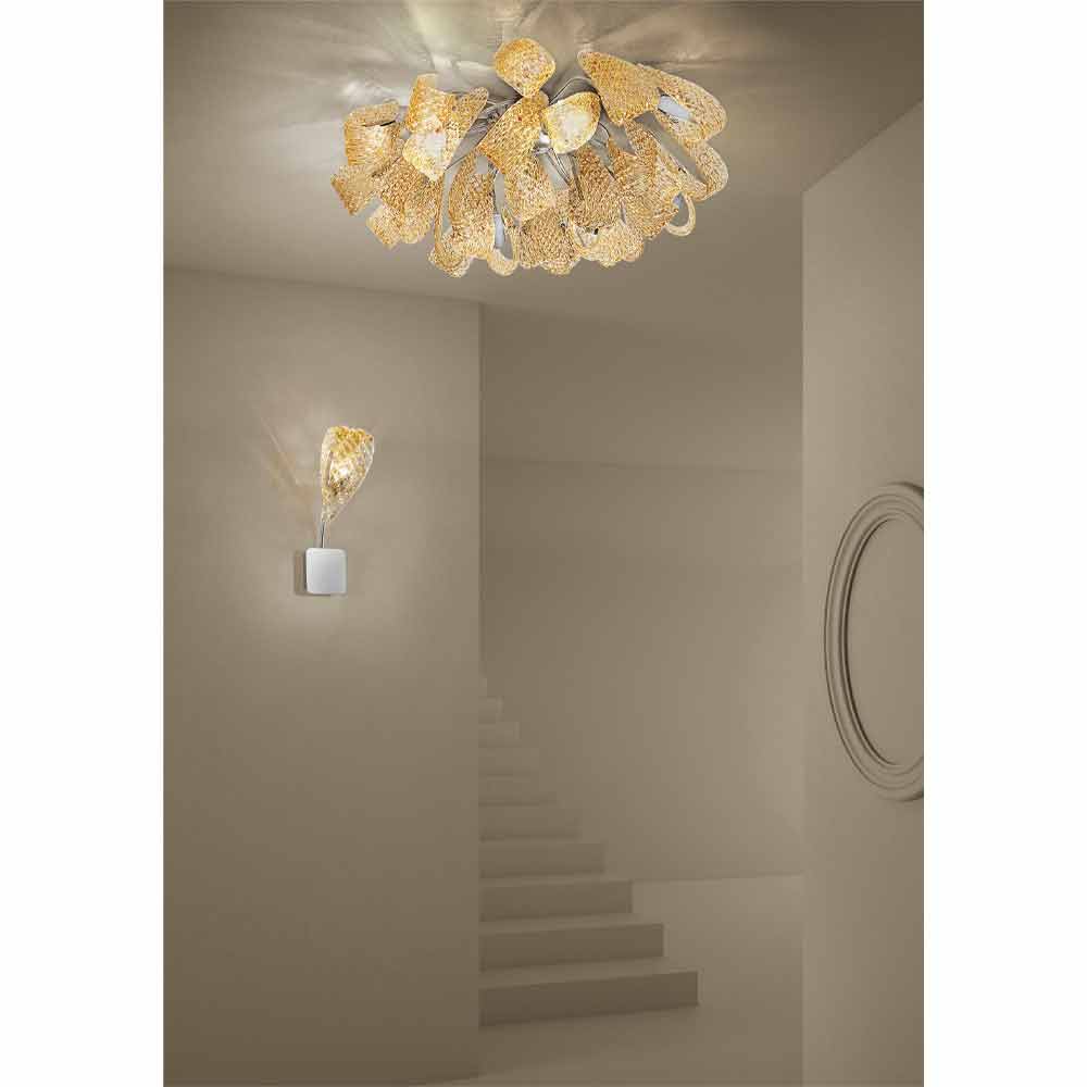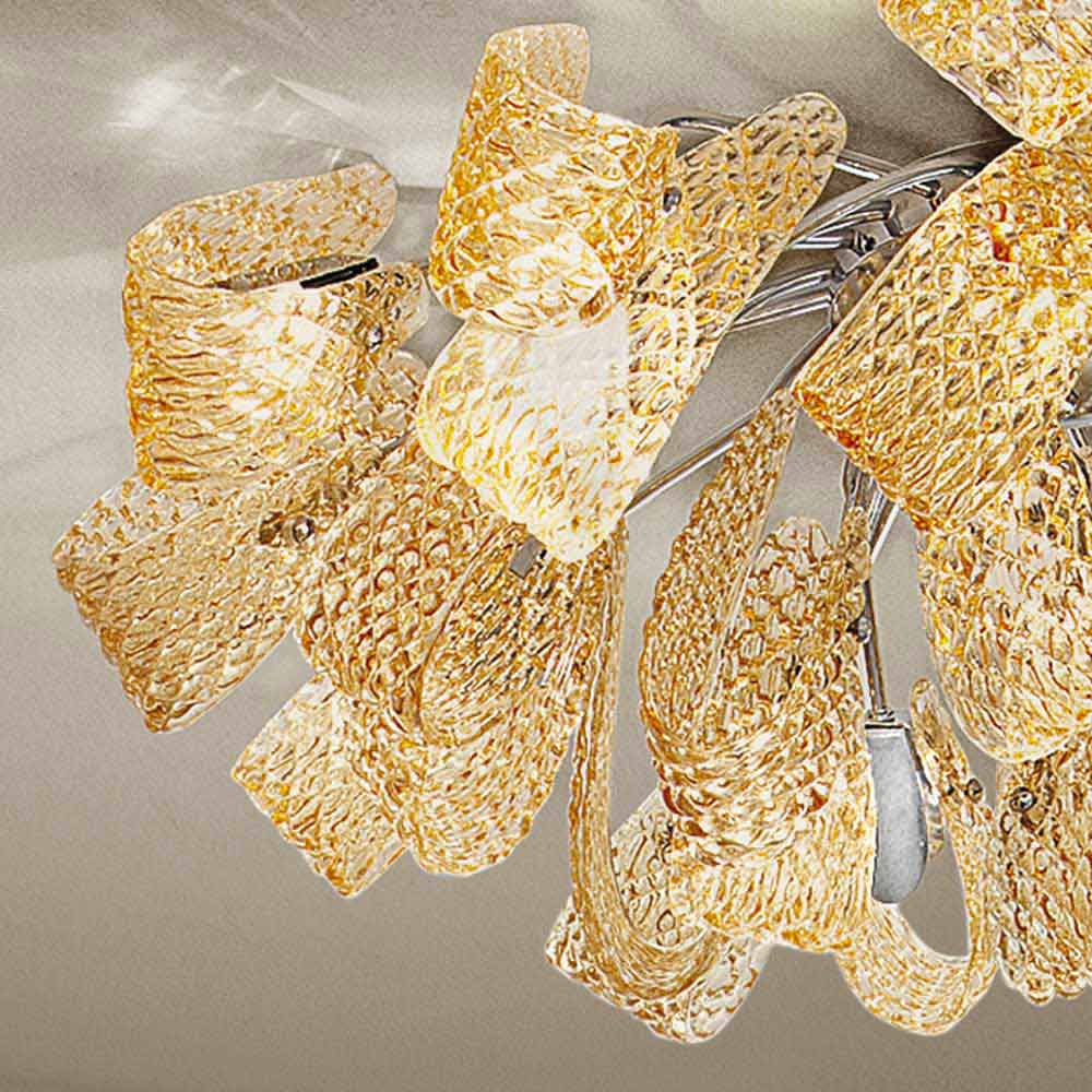 Elegantní a majestátní stropní svítidlo vyrobené v Itálii v ručně vyrobeném benátském skle s jantarovou povrchovou úpravou s detaily z leštěného chromovaného kovu . Myšlenka osvětlení složená z smyslných stužek a neobvyklých textur, které dodávají její estetickou originalitu a smysl pro dynamiku . Zarážející je geometrická struktura, která pokrývá skleněný povrch, na kterém se světlo odráží v kovových detailech, pro nádherné hry odrazů . Výsledkem je nádherné stropní světlo schopné přizpůsobit se jakémukoli současnému prostředí a dát charakter klasičtějším prostorům, což se ukázalo jako obzvláště univerzální.