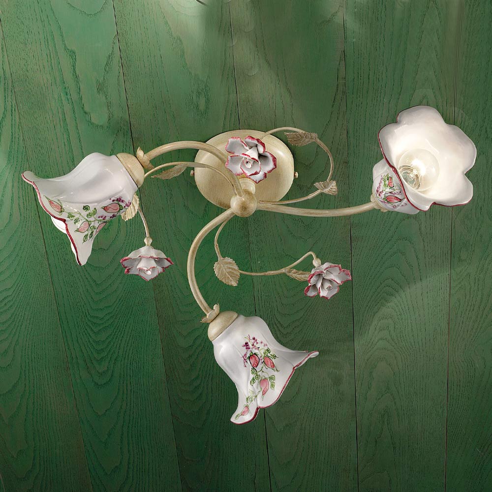 Stropní svítidlo se 3 světly z kovu a keramiky s ručně malovanými růžemi italské výroby Ferroluce.