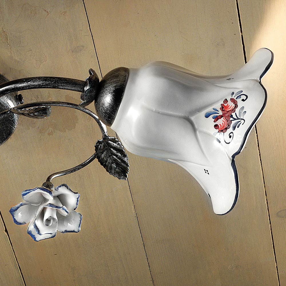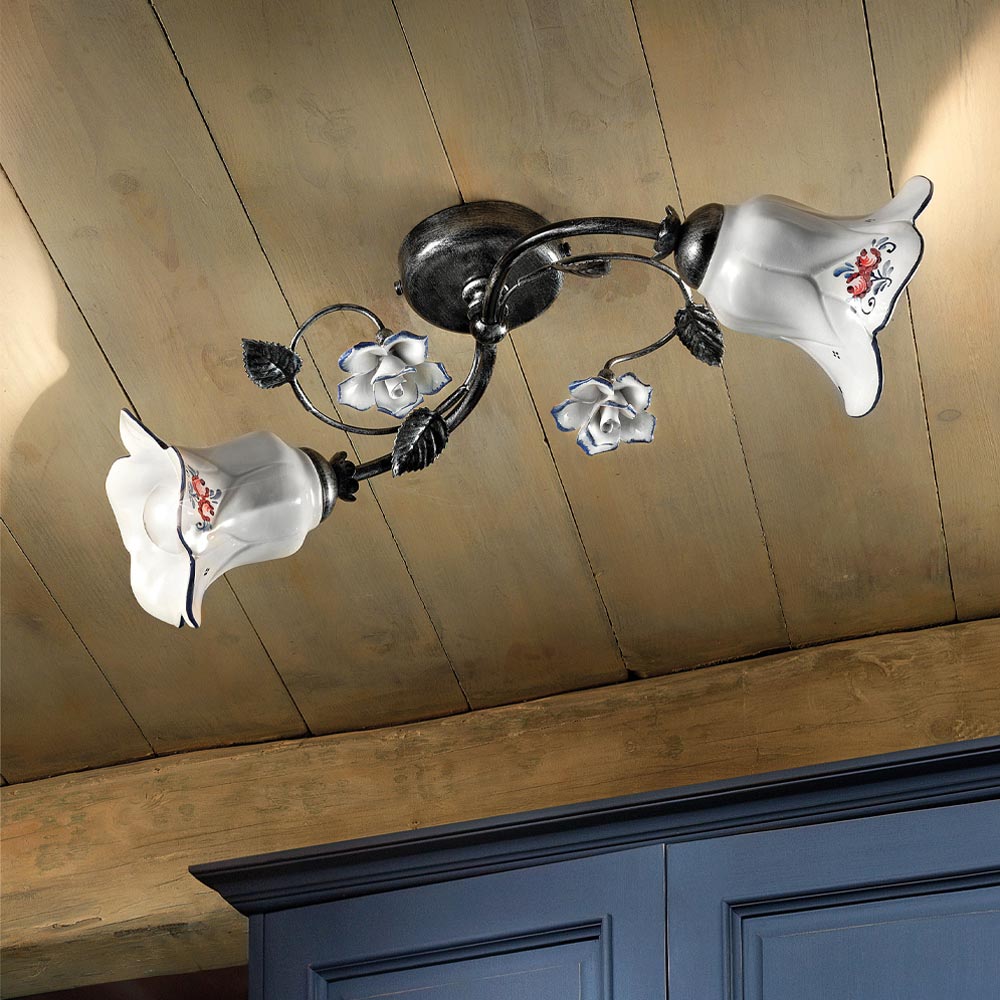 Stropní svítidlo se 2 světly z kovu a keramiky s ručně malovanými růžemi italské výroby Ferroluce.