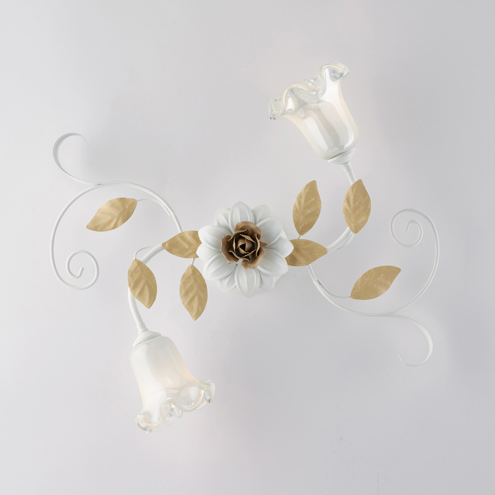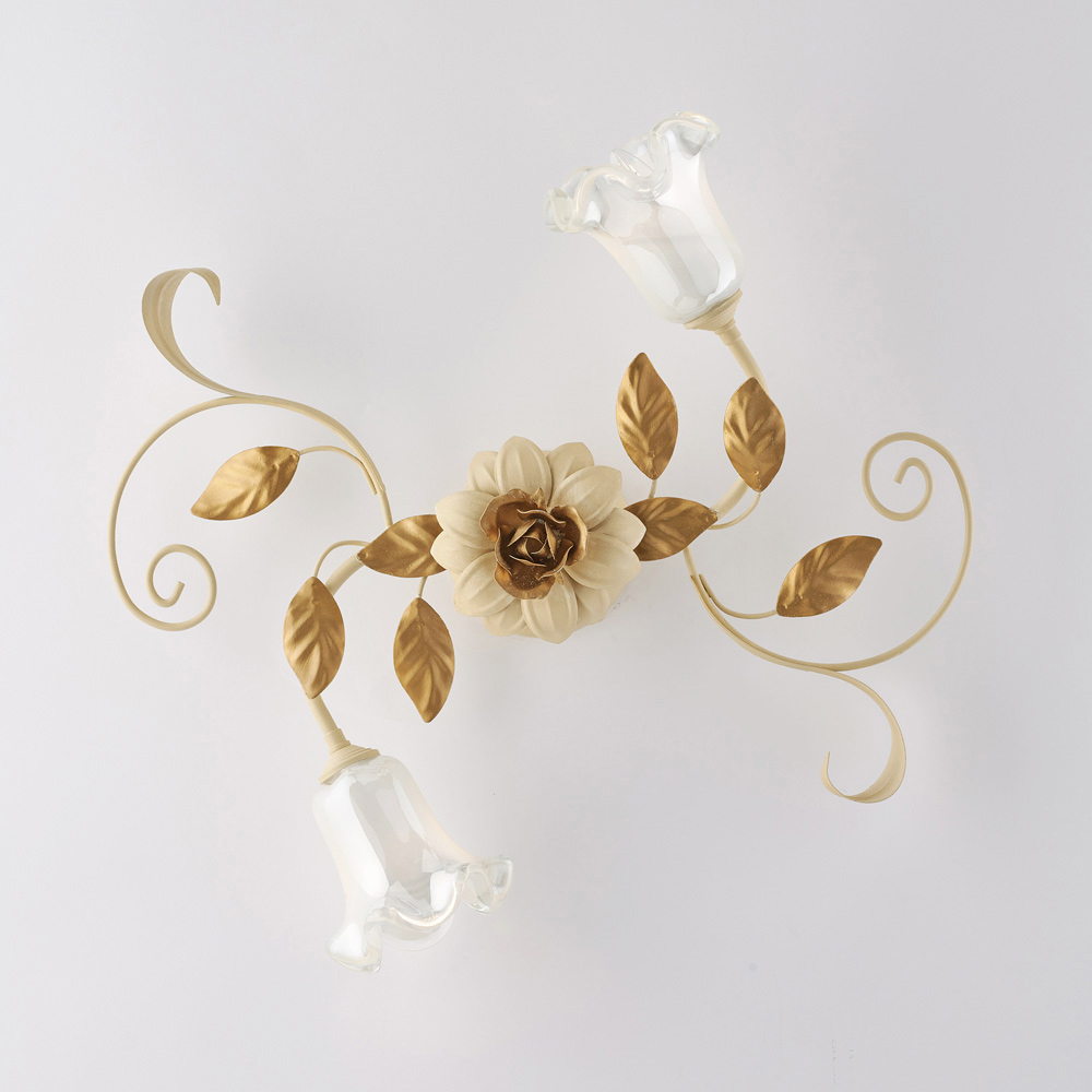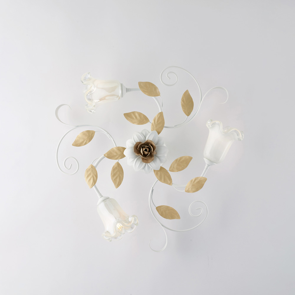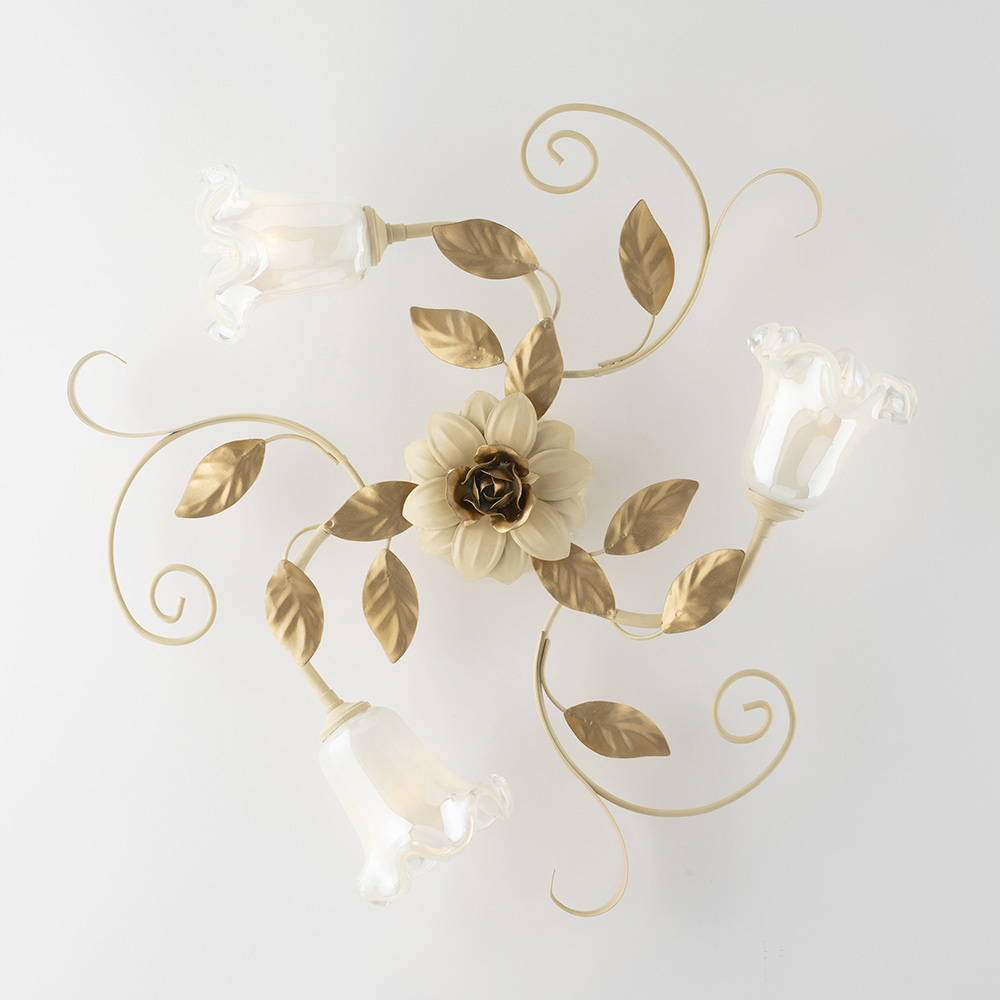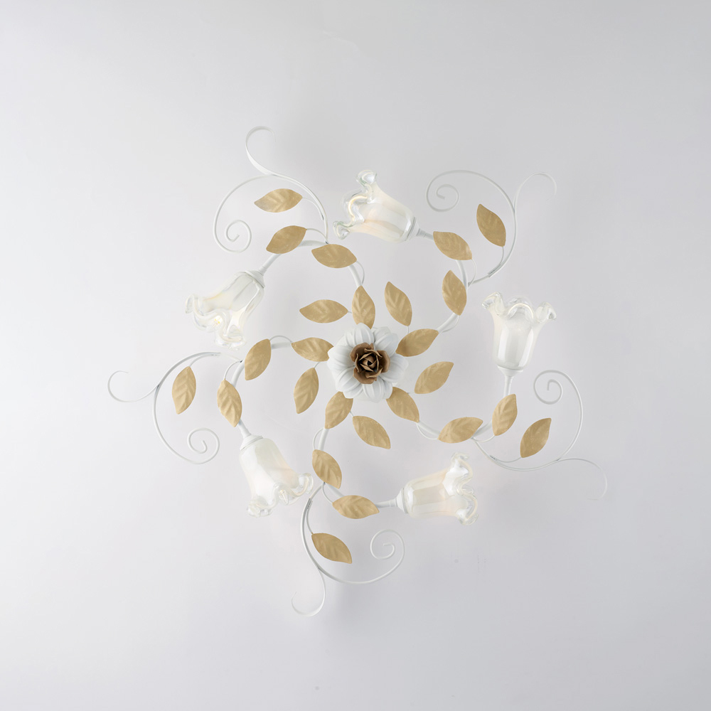 Toto klasické ručně vyrobené stropní svítidlo z lakovaného železa ve slonovinové barvě je rafinované a dekorativní, je světelným výtvorem se silným romantickým charakterem. Květinová struktura, zdobená vlnitými kudrlinkami, ozdobnými listy a skleněnými difuzory ve tvaru květin , dodává stropu lehkou a harmonickou eleganci a proměňuje světlo ve skutečný dekorativní prvek.