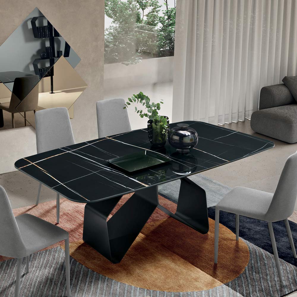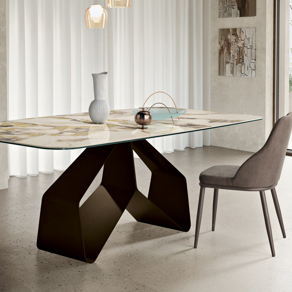 Kombinace materiálnosti keramiky a sochařské kovové konstrukce vytváří dokonalou rovnováhu mezi moderním designem a funkčností, díky čemuž je tento stůl protagonistou jídelního koutu.