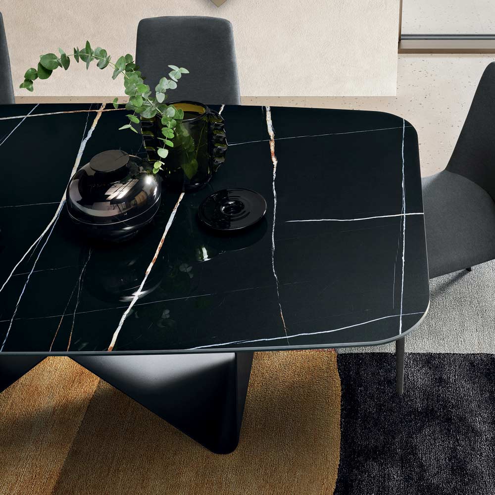 Keramická deska s mramorovým efektem, nanesená na sklo, realisticky reprodukuje přirozenou texturu kamene a zároveň nabízí odolný a praktický povrch. Keramika zaručuje vysokou odolnost vůči poškrábání, teplu a skvrnám, díky čemuž je stůl ideální pro každodenní použití.