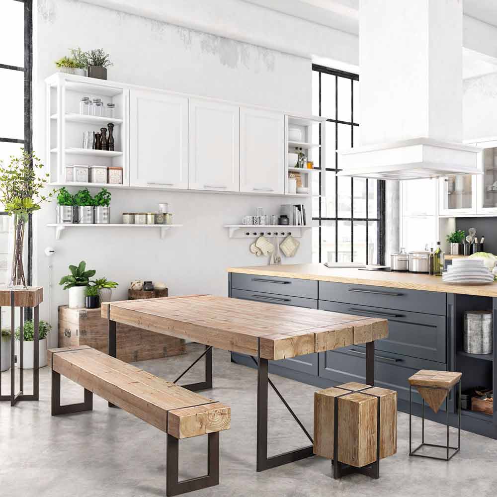 Jídelní stůl v moderním průmyslovém stylu s deskou z jedle.