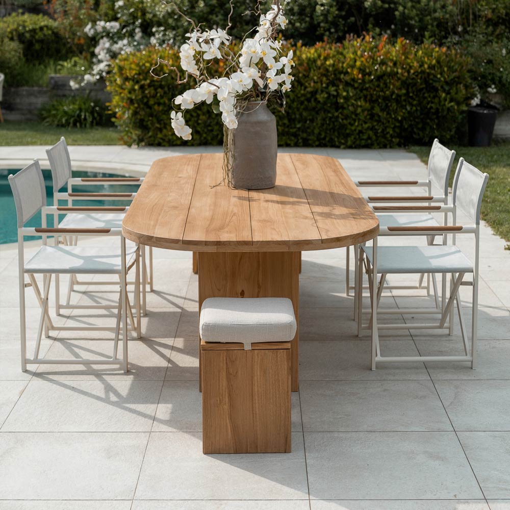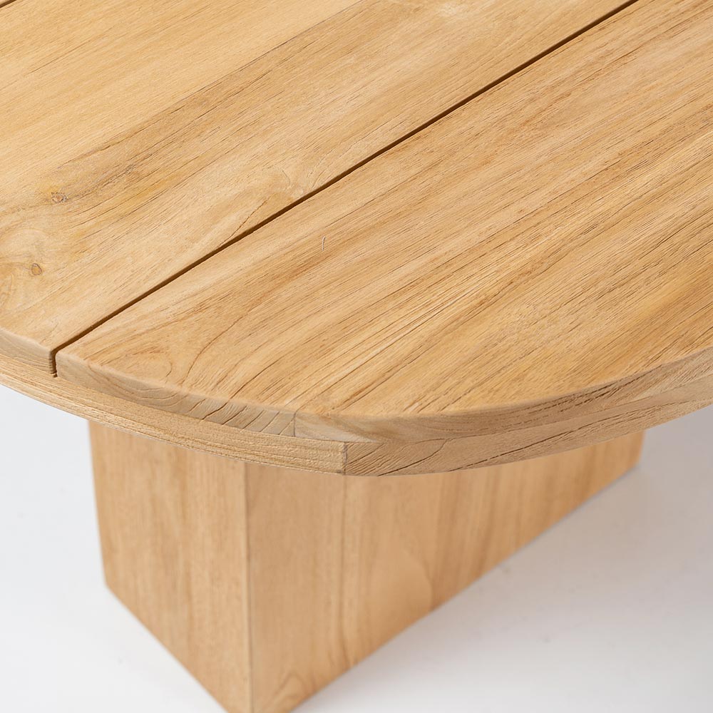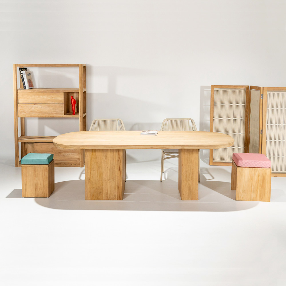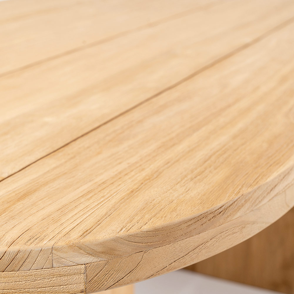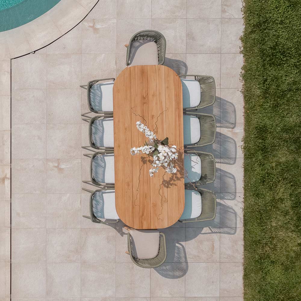 Stůl s deskou z kartáčovaného teakového dřeva s podélnými lamelami (vnější tloušťka 40 mm) a zaoblenými rohy. Teakové podnože různých velikostí (minimálně 2) pro každou velikost desky. Konstrukce tohoto stolu se vyznačuje klasickými, křivolakými liniemi a velkorysými rozměry dřevěných sekcí. Tato designová a funkční kompozice se stává jednoduchým, ale harmonicky proporcionálním prvkem , vhodným pro jakékoli venkovní prostředí, jako jsou terasy, verandy, zahrady nebo bazény, a vytváří tak podmanivou atmosféru. Teakové dřevo použité při jeho výrobě zaručuje kvalitu a trvanlivost v průběhu času, díky čemuž je tento bytový doplněk ideální pro jakékoli prostředí a příležitost. Kartáčovaná povrchová úprava zdůrazňuje kresbu a přirozené vlastnosti teakového dřeva.