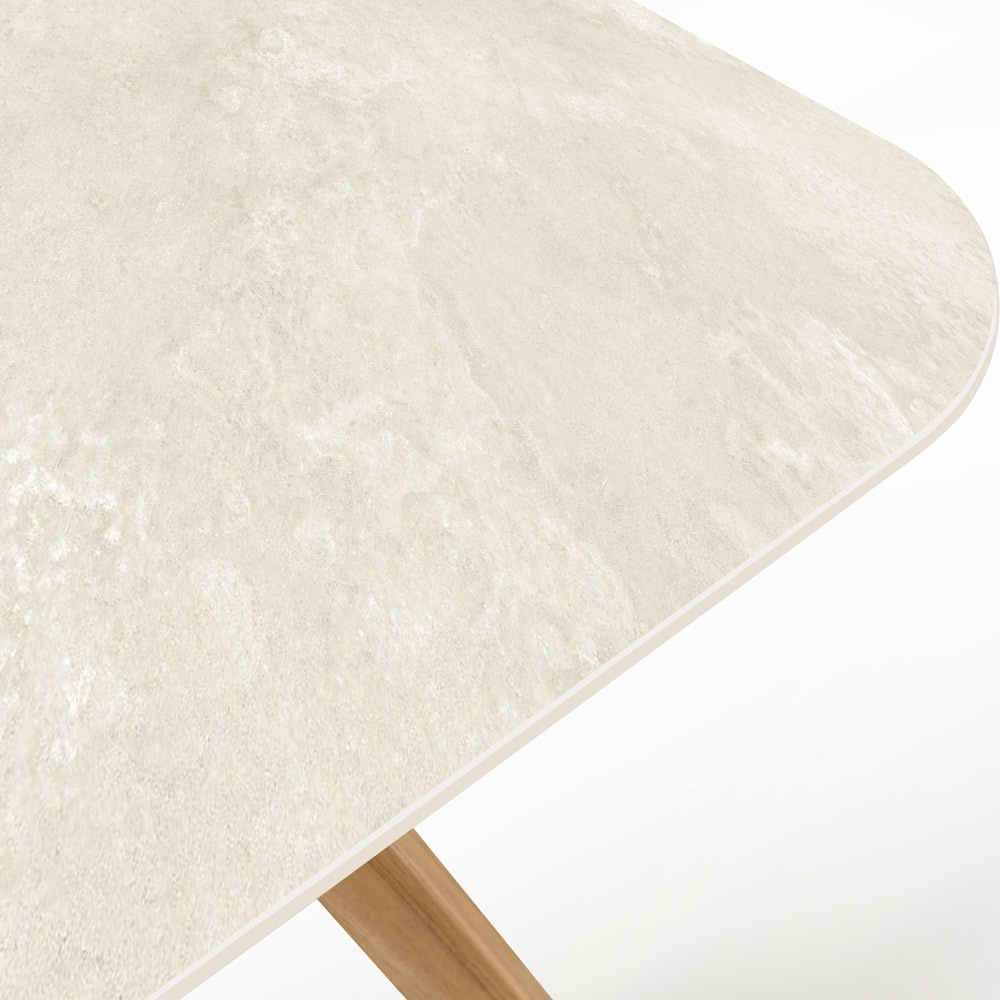 vyrobený v Itálii. Tento venkovní stůl je designový kousek, který pozvedne jakýkoli venkovní prostor díky své vyváženosti přirozené elegance a modernity. Stůl se vyznačuje keramickou deskou inspirovanou kamenem Chianca di Ostuni , známým svou neutrální barvou a texturou připomínající přírodní kámen, což mu dodává nádech rustikálního a zároveň moderního stylu.