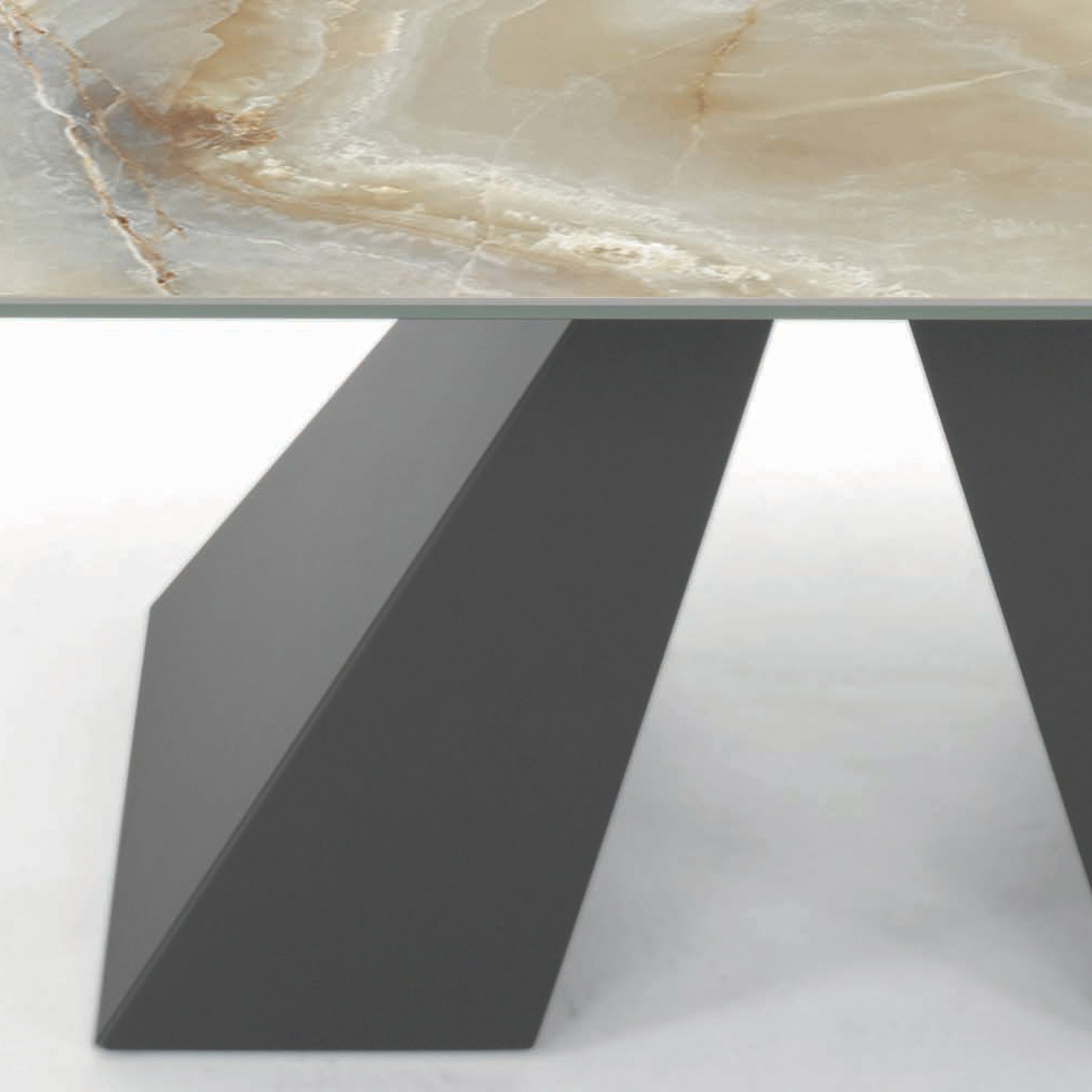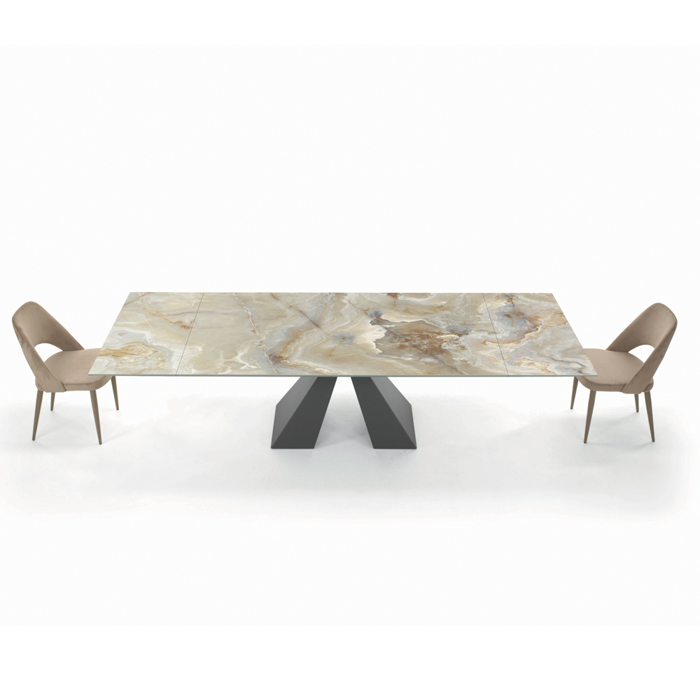 Rozkládací stůl do obývacího pokoje s integrovanými nástavci, keramická deska v lesklé zlaté onyxové úpravě , rovná hrana, základna z