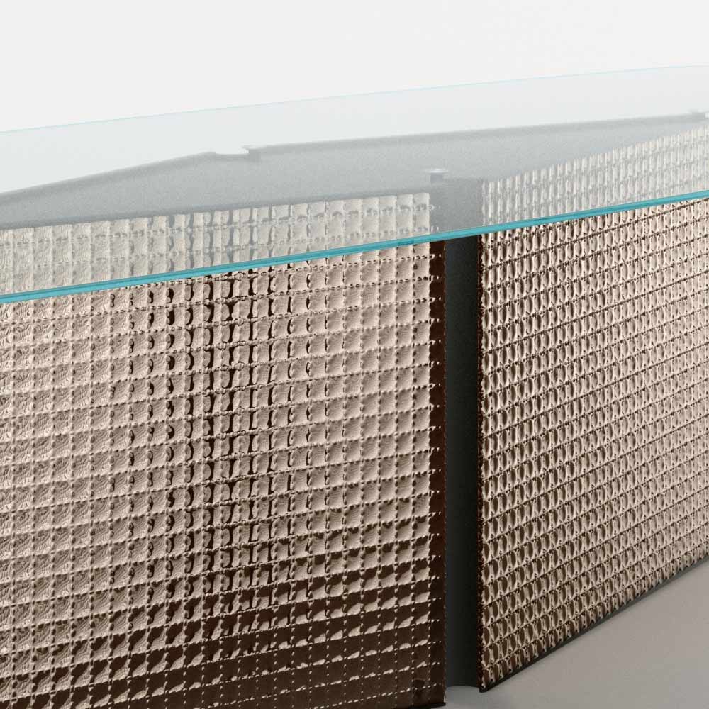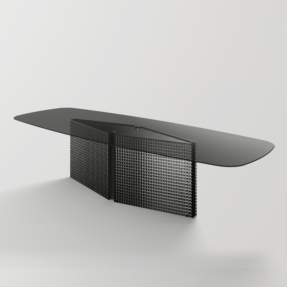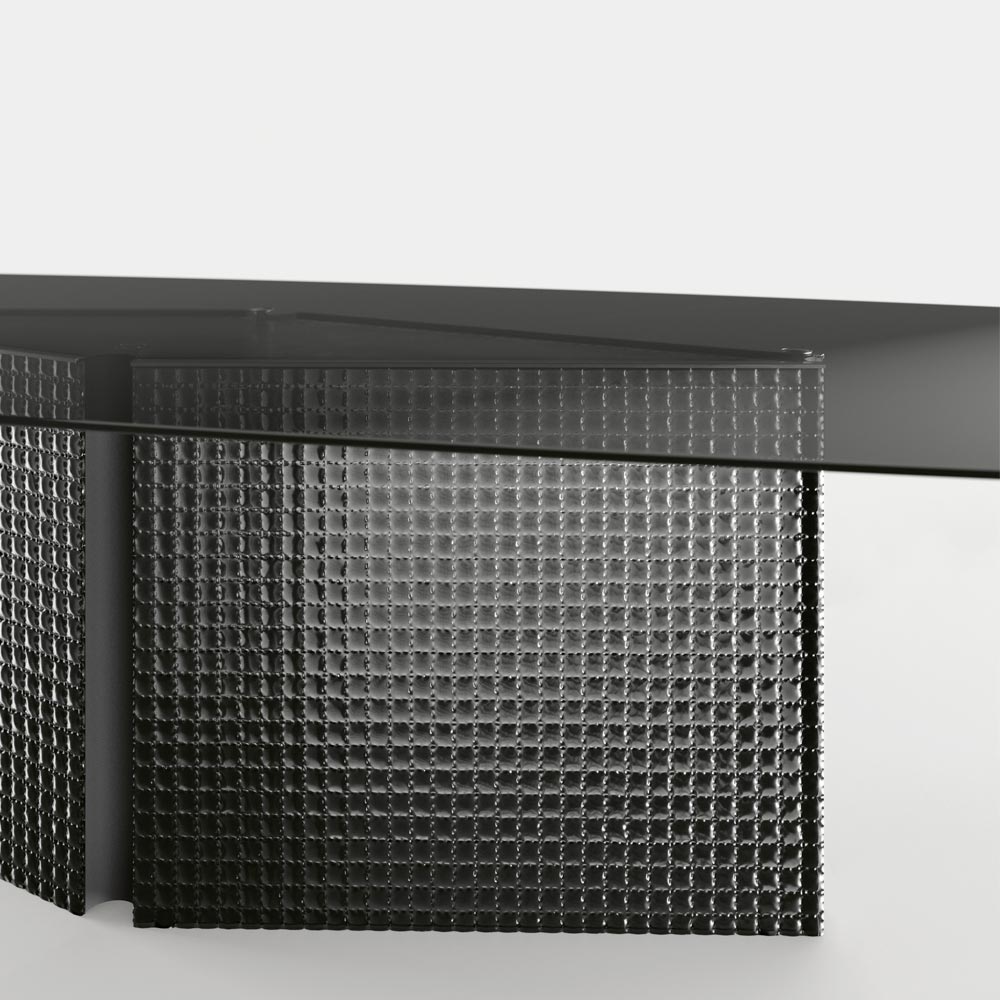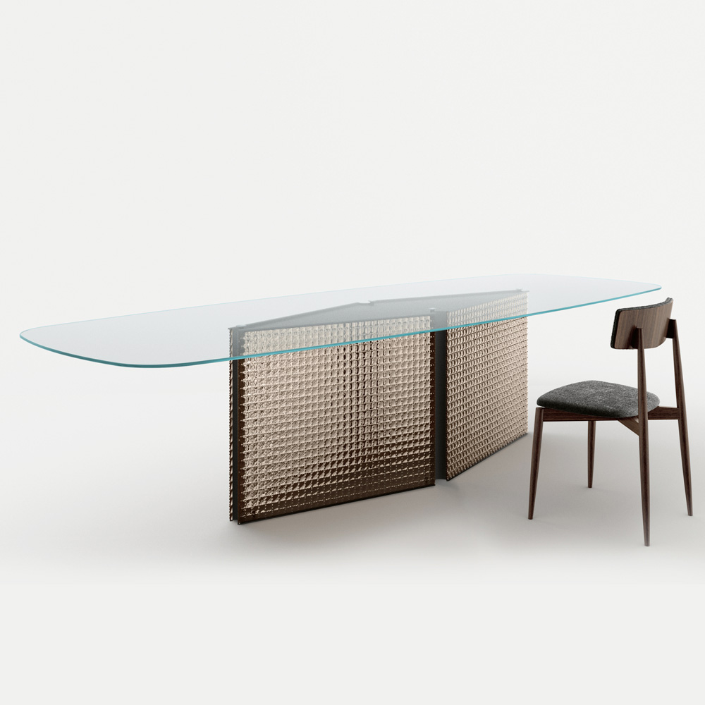 Tvarovaný stůl z tvrzeného skla a základna z taveného skla