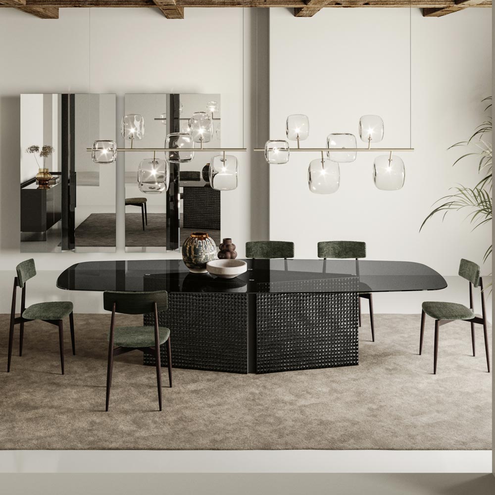Tento jídelní stůl je příkladem avantgardního designu, který spojuje eleganci a funkčnost . Jeho štíhlá, protáhlá silueta se skleněnou deskou nabízí hladký, rafinovaný povrch, ideální pro formální stolování nebo jako ústřední bod v moderním designovém prostoru.