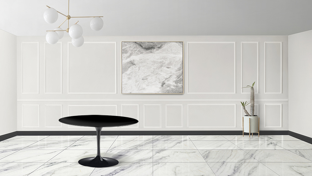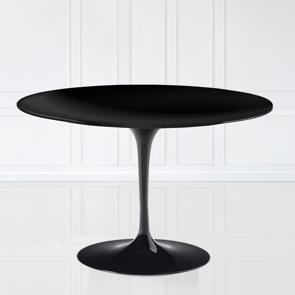 Kulatý jídelní stůl s deskou z černého tekutého laminátu a podnoží z černého leštěného hliníku Made in Italy