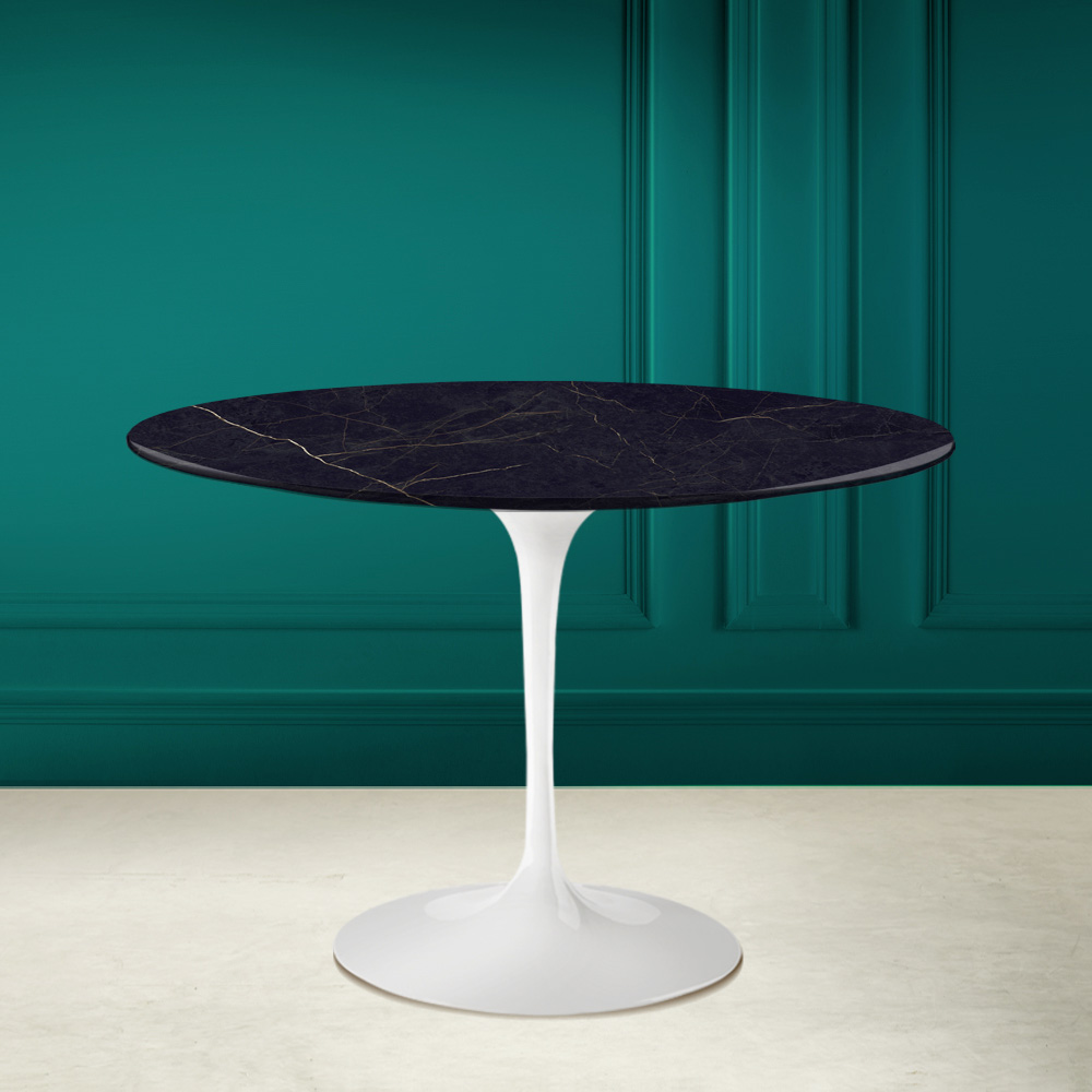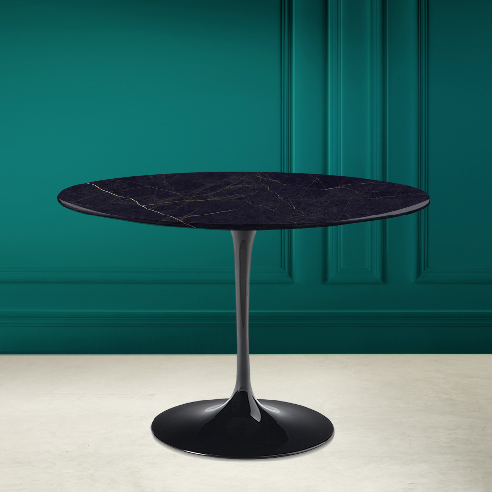 Jídelní stůl s kulatou deskou z keramiky noir laurent a podnoží z leštěného hliníku Made in Italy